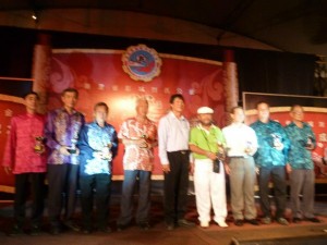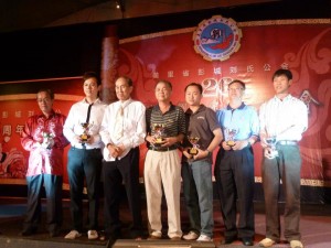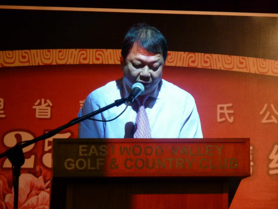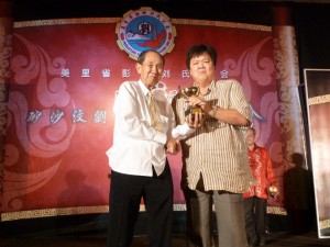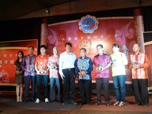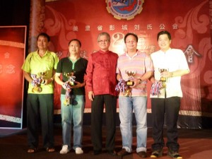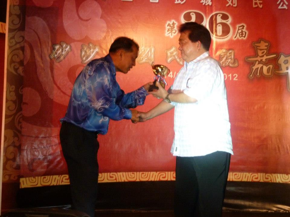 拿督久健宗长颁发团体杯冠军予砂罗越彭城刘氏公会由主席拿督增强宗长接领。
