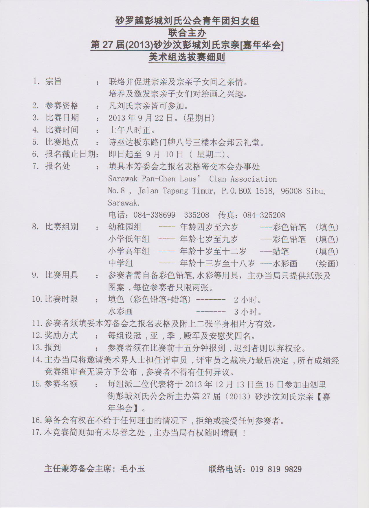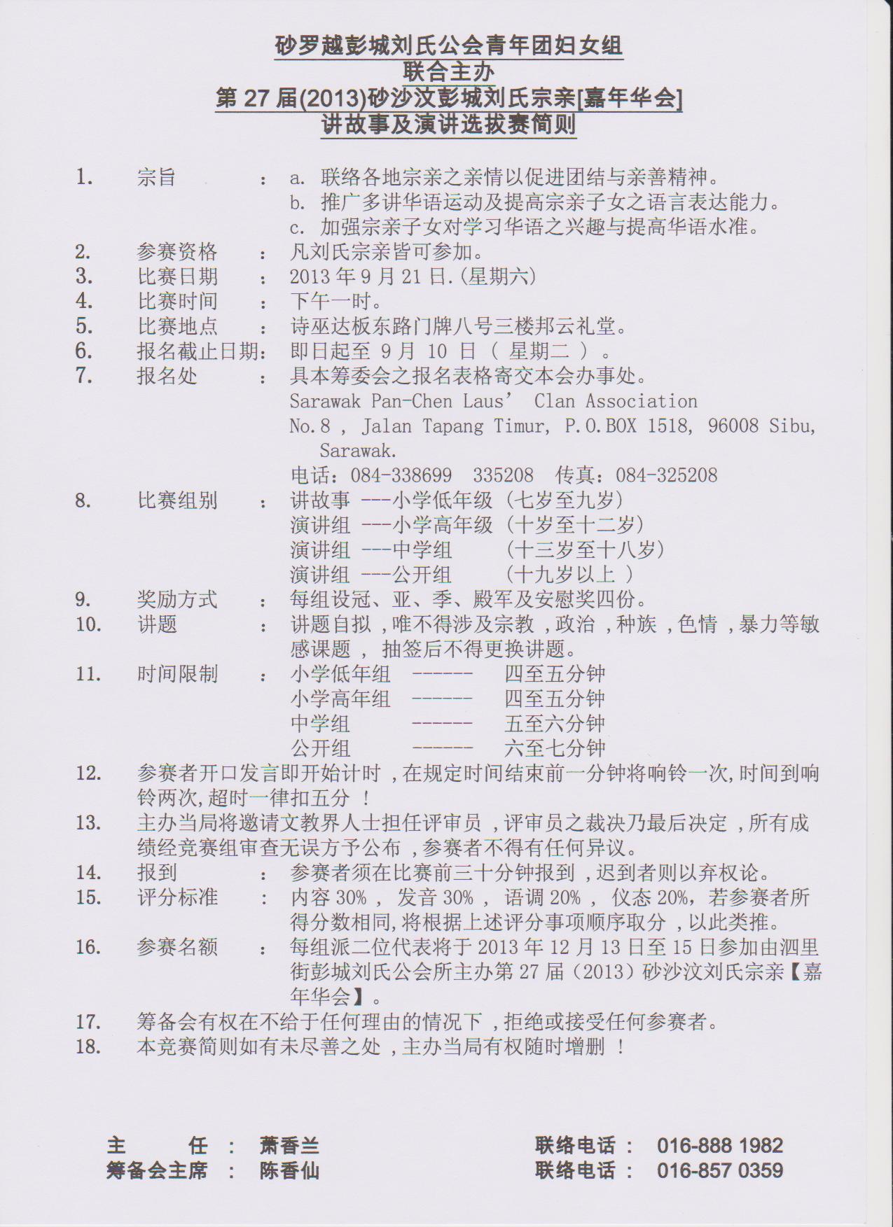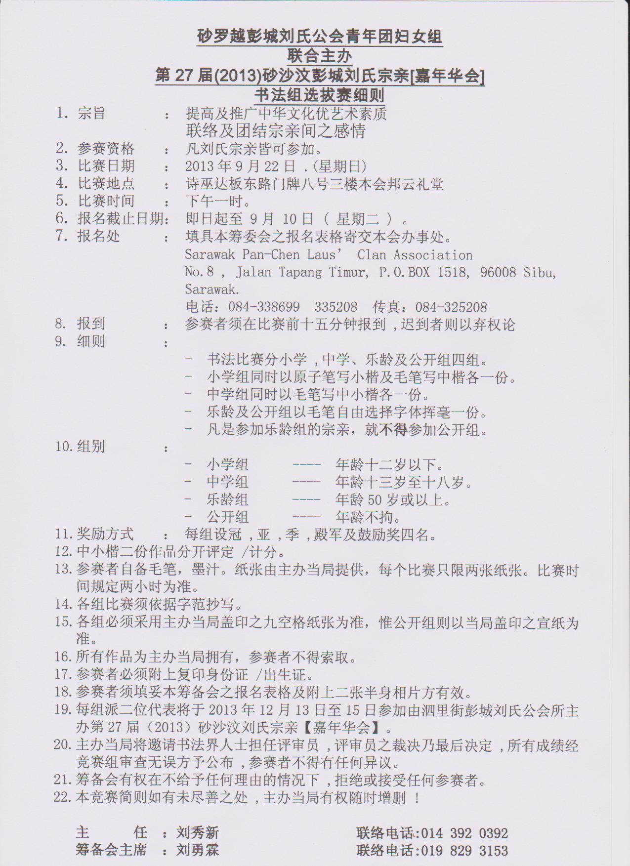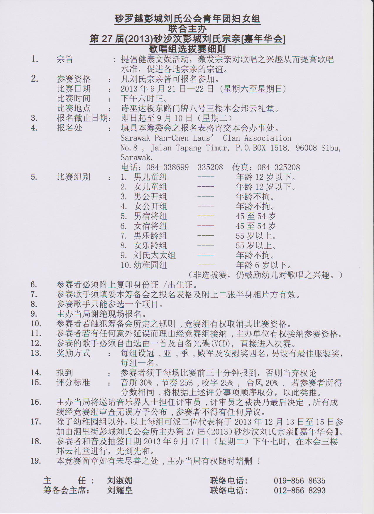 [通告】砂罗越彭城刘氏公会青年团妇女组联合主办第27届(2013)砂沙汶彭城刘氏宗亲[嘉年华会]各项选拔赛细则及筹备会阵容--21/09-22/09/13 Posted by admin | On 3 8 月,2013 | In 未分類 Related Posts 【通告】砂罗越彭城刘氏公会乐龄组主办庆祝圣诞节暨乐龄卡拉ok歌唱赛--23.12.2014 砂罗越彭城刘氏公会 贷学金接受申请-10.09.2023 砂罗越彭城刘氏公会第30届砂沙汶彭城刘氏宗亲【嘉年华会】歌唱选拔赛兼闭幕礼--21-8-2016 About Author admin Leave a Reply發佈留言必須填寫的電子郵件地址不會公開。 必填欄位標示為 *顯示名稱 * 電子郵件地址 * 個人網站網址 在瀏覽器中儲存顯示名稱、電子郵件地址及個人網站網址,以供下次發佈留言時使用。 Δ