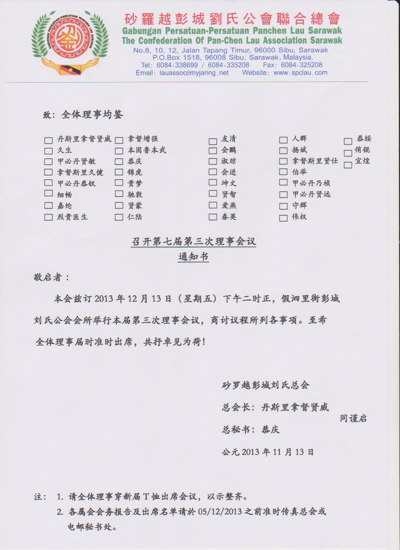 【通告】砂罗越彭城刘氏公会联合总会第七届第三次理事会议通知书--13.12.2013 Posted by admin | On 21 11 月,2013 | In 未分類 Related Posts 砂罗越彭城刘氏公会第十七届【2011-2012】理事 第28届砂沙汶彭城刘氏宗亲【嘉年华会】欢送宴--14-12-2014 世界刘氏联谊总会青年总团与砂罗越彭城刘氏公会理事、青年团、妇女组及乐龄组交流会---11-6-2016 About Author admin Leave a Reply發佈留言必須填寫的電子郵件地址不會公開。 必填欄位標示為 *顯示名稱 * 電子郵件地址 * 個人網站網址 在瀏覽器中儲存顯示名稱、電子郵件地址及個人網站網址,以供下次發佈留言時使用。 Δ