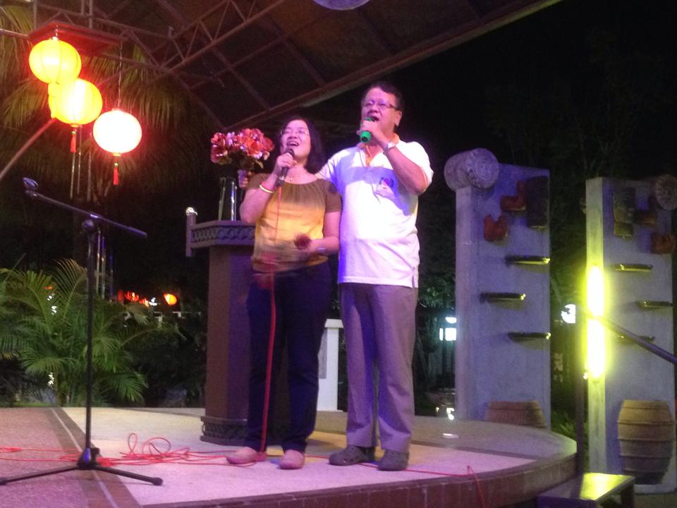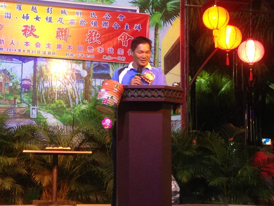 筹备会主席华秋致欢迎词。举办中秋晚会目的是发扬华族传统文化,也让刘氏公会领导层和会员们之间有互动及沟通的机会,更使领导层和会员们的关系更密切。同时,也让会员们在活动过程中感受到刘氏大家庭欢聚一堂的气氛。联欢会也是一家人相聚的好机会。希望晚会动听的歌曲、互动欢乐的游戏及幸运抽奖,使整个晚会自始至终洋溢著热烈、欢乐的气氛,能使大家度过一个轻松愉快,欢乐的中秋佳节。