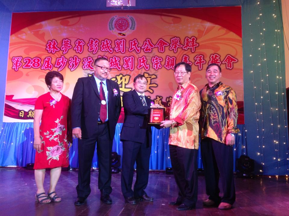 总会长丹斯里拿督贤威宗长颁发给美里彭城刘氏公会由拿督斯里久健宗长代领。
