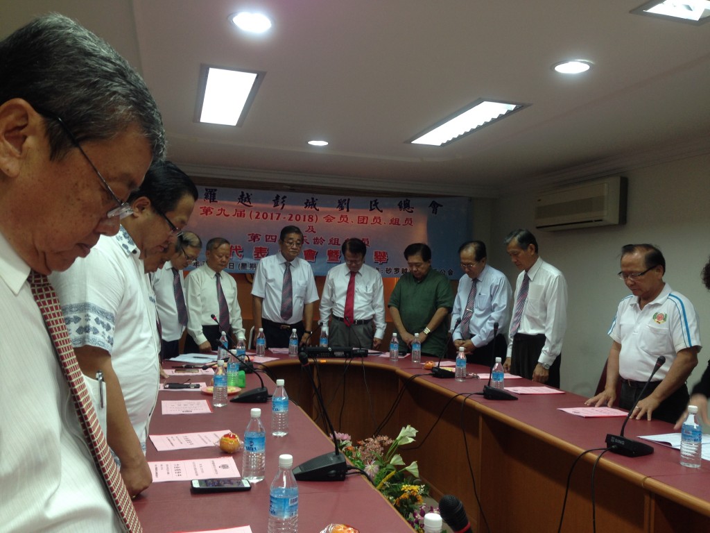 去年12月7日,我們敬愛的砂劉總會長丹斯里賢威宗長不敵病魔,與世長辭,令人悲慟不已,我建議大家共同起立,為他默哀一分鐘,願他在永生的國度裡,繼續榮耀我劉家人!(謝謝大家)