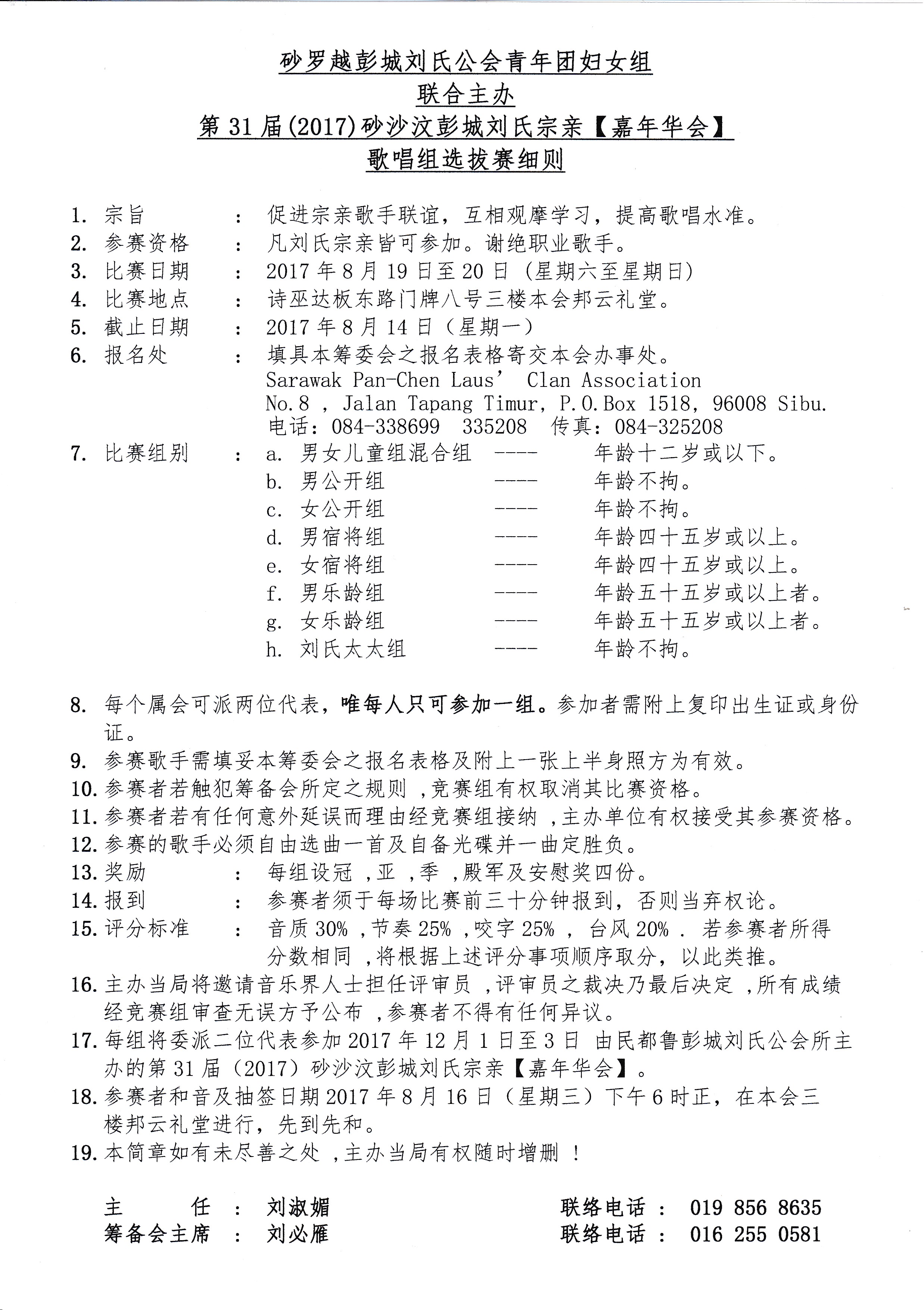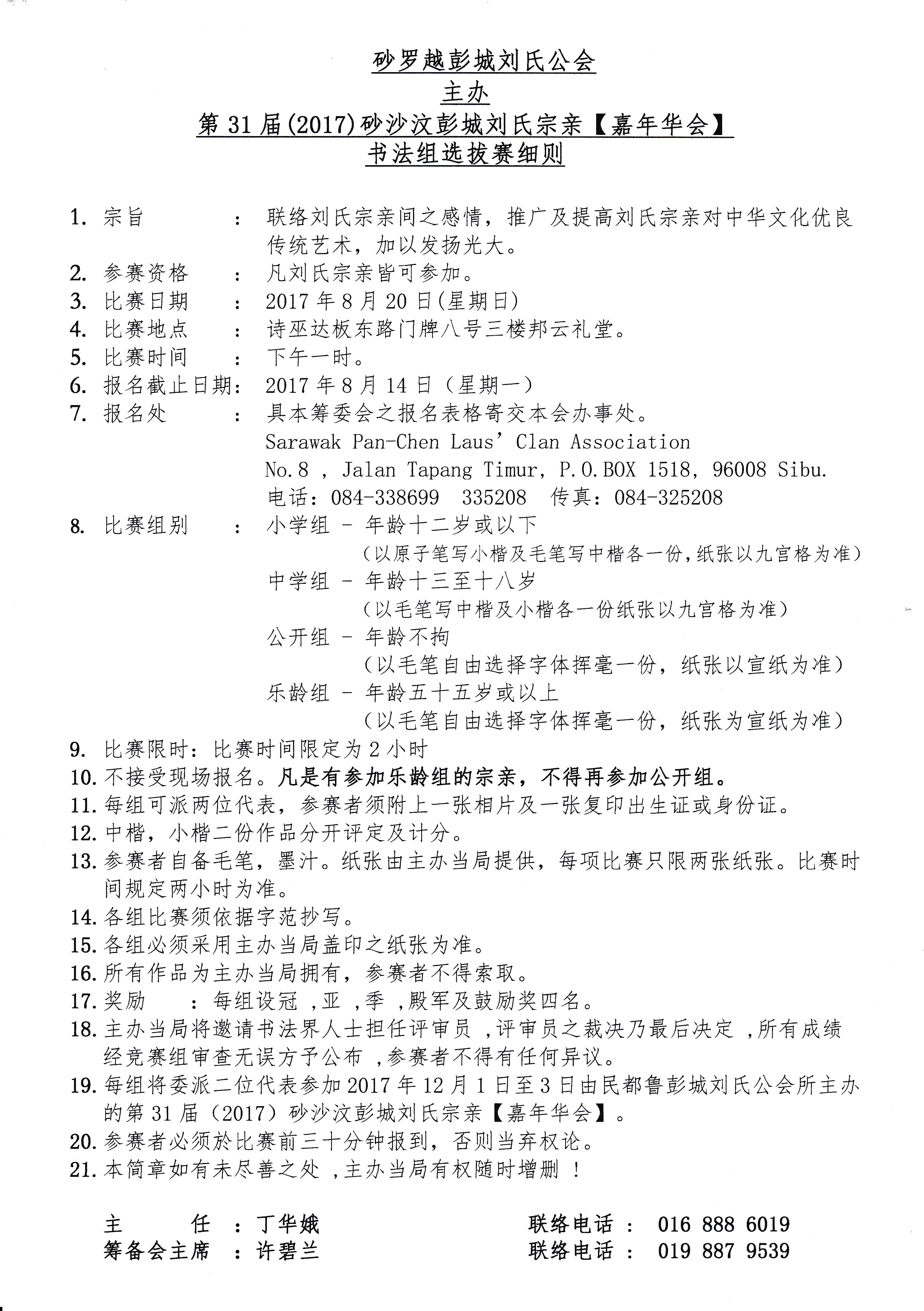 砂罗越彭城刘氏公会青年团妇女组联合主办第31届(2017)砂沙汶彭城刘氏宗亲【嘉年华会】选拔赛细则--19-20.07.17 Posted by admin | On 7 7 月,2017 | In 未分類 Related Posts 【通告】罗越彭城刘氏公会青年团妇女组第十五届团委/第十六届组委 --【第十一次联席会议】--21-11-2012 砂罗越彭城刘氏公会奖励金即日起至10月9日中午十二时接受申请--21-9-2021 砂拉越彭城刘氏公会联合总会第七届(2013-2014)第四次理事会议在林梦Purnama Hotel召开--13-12-2014 About Author admin Leave a Reply發佈留言必須填寫的電子郵件地址不會公開。 必填欄位標示為 *顯示名稱 * 電子郵件地址 * 個人網站網址 在瀏覽器中儲存顯示名稱、電子郵件地址及個人網站網址,以供下次發佈留言時使用。 Δ