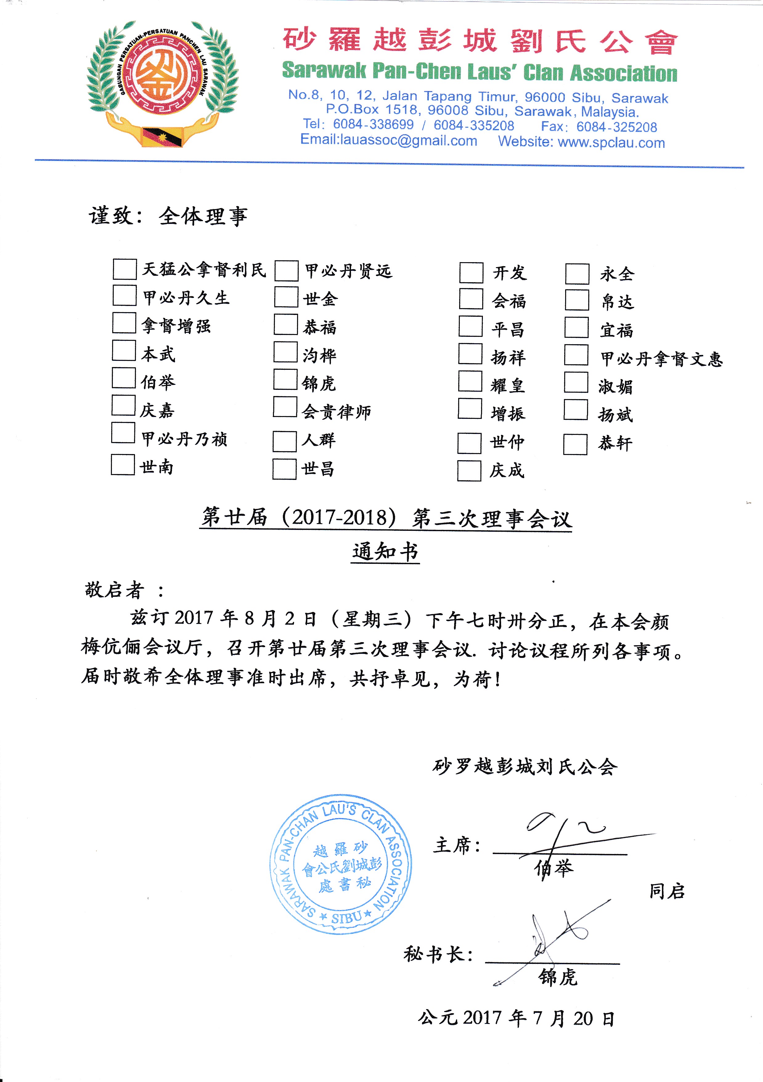 砂罗越彭城刘氏公会的第廿届(2017-2018)理事第三次理事会议通知书-02.08.2017 Posted by admin | On 29 7 月,2017 | In 未分類 Related Posts 砂罗越彭城刘氏公会颁发刘氏宗亲子女教育奖励金暨刘雅芬师姑奖励金---24.05.2015 砂罗越彭城刘氏公会青年团妇女组联合主办砂沙汶彭城刘氏宗亲【嘉年华会】美术组选拔赛--26-8-2012 马来西亚刘氏总会•属会会长/主席名录--07-09-2012 About Author admin Leave a Reply發佈留言必須填寫的電子郵件地址不會公開。 必填欄位標示為 *顯示名稱 * 電子郵件地址 * 個人網站網址 在瀏覽器中儲存顯示名稱、電子郵件地址及個人網站網址,以供下次發佈留言時使用。 Δ