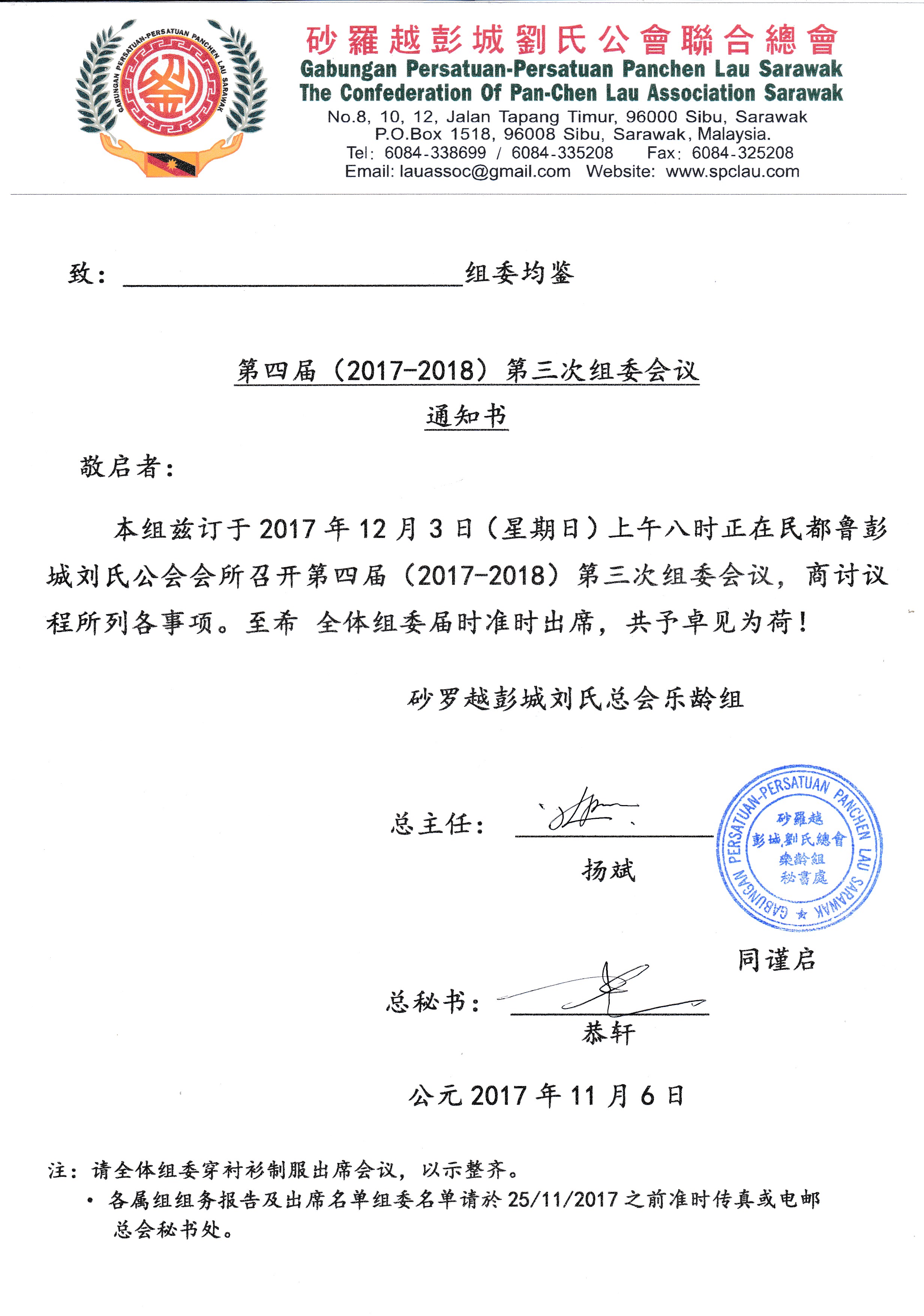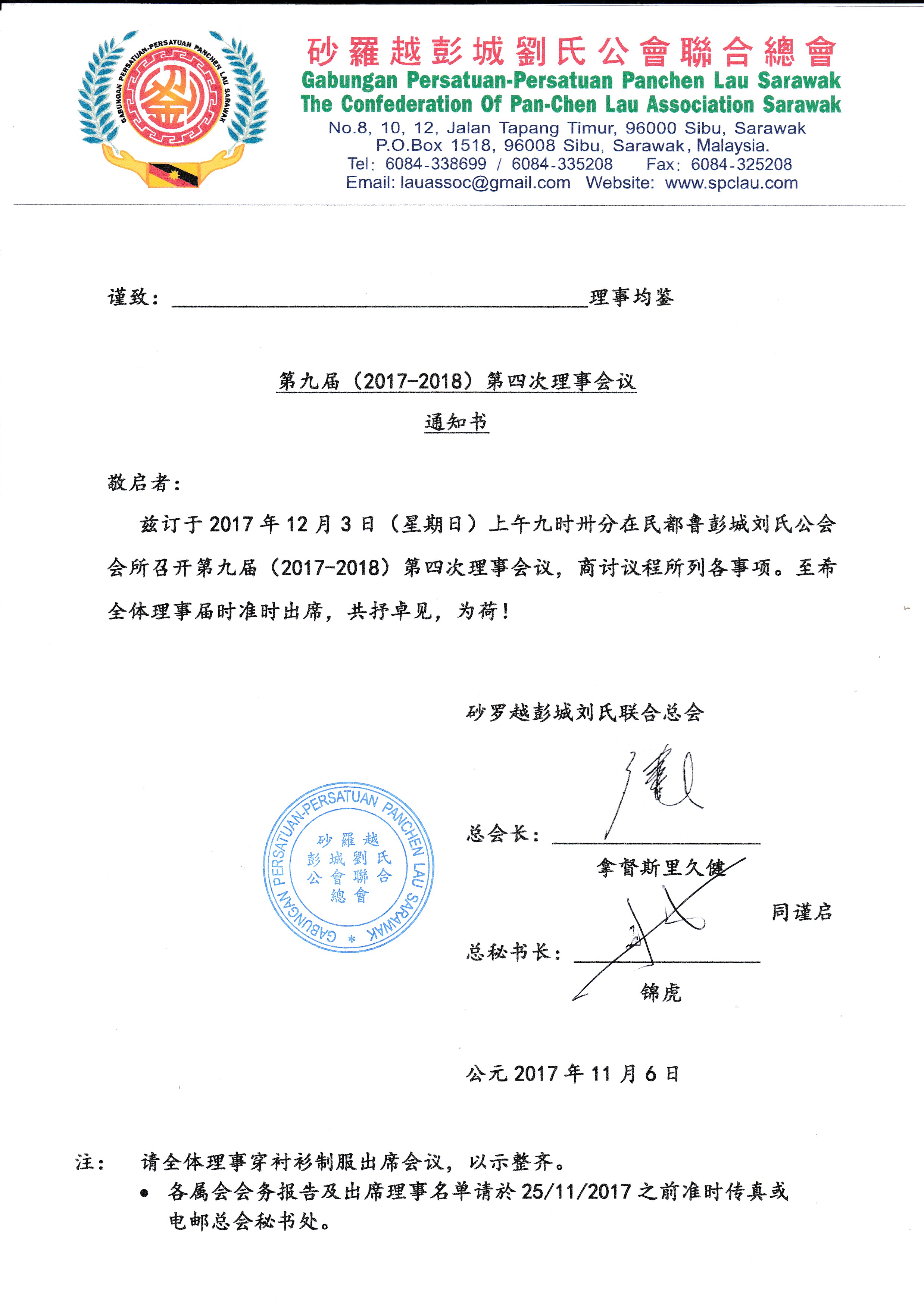 砂刘总会第九届第四次理事会议、青年年团妇女组第三次联席会议及乐龄组第三次会议通知书--3-12-2017 Posted by admin | On 8 11 月,2017 | In 未分類 Related Posts 马来西亚刘氏总会青年团妇女组联合主催.雪隆刘氏公会青年团妇女组联合主办.砂罗越彭城刘氏公会青年团妇女组联合协办.第六届【马来西亚刘氏宗亲常识比赛暨第十二届砂罗越彭城刘氏联合总会常识比赛】--28.09.2014 马来西亚刘氏总会第三届第三次(2013-2015)会员代表大会--22-3-2015 【通告】砂罗越彭城刘氏公会青年团妇女组联合主办第29届砂沙汶彭城刘氏宗亲【嘉年华会】各组选拔赛比赛日期及时间表---22-23.08.2015 About Author admin Leave a Reply發佈留言必須填寫的電子郵件地址不會公開。 必填欄位標示為 *顯示名稱 * 電子郵件地址 * 個人網站網址 在瀏覽器中儲存顯示名稱、電子郵件地址及個人網站網址,以供下次發佈留言時使用。 Δ