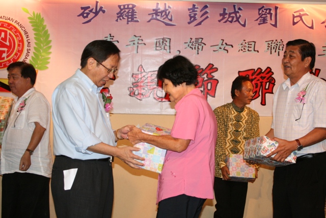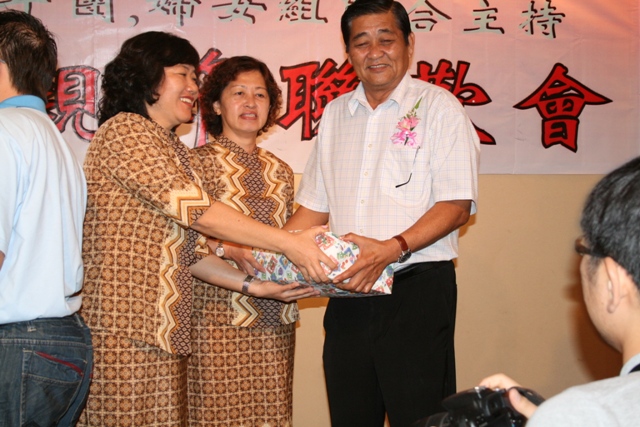 本会妇女组财政汪丽华赠送父母礼物予副主席刘伯举 .
