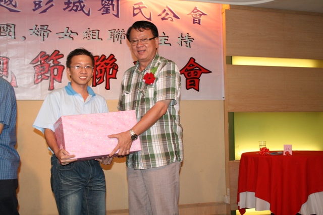 本会演讲会会长刘帛达颁发幸运桌礼物予筹备会主席刘缵兴.