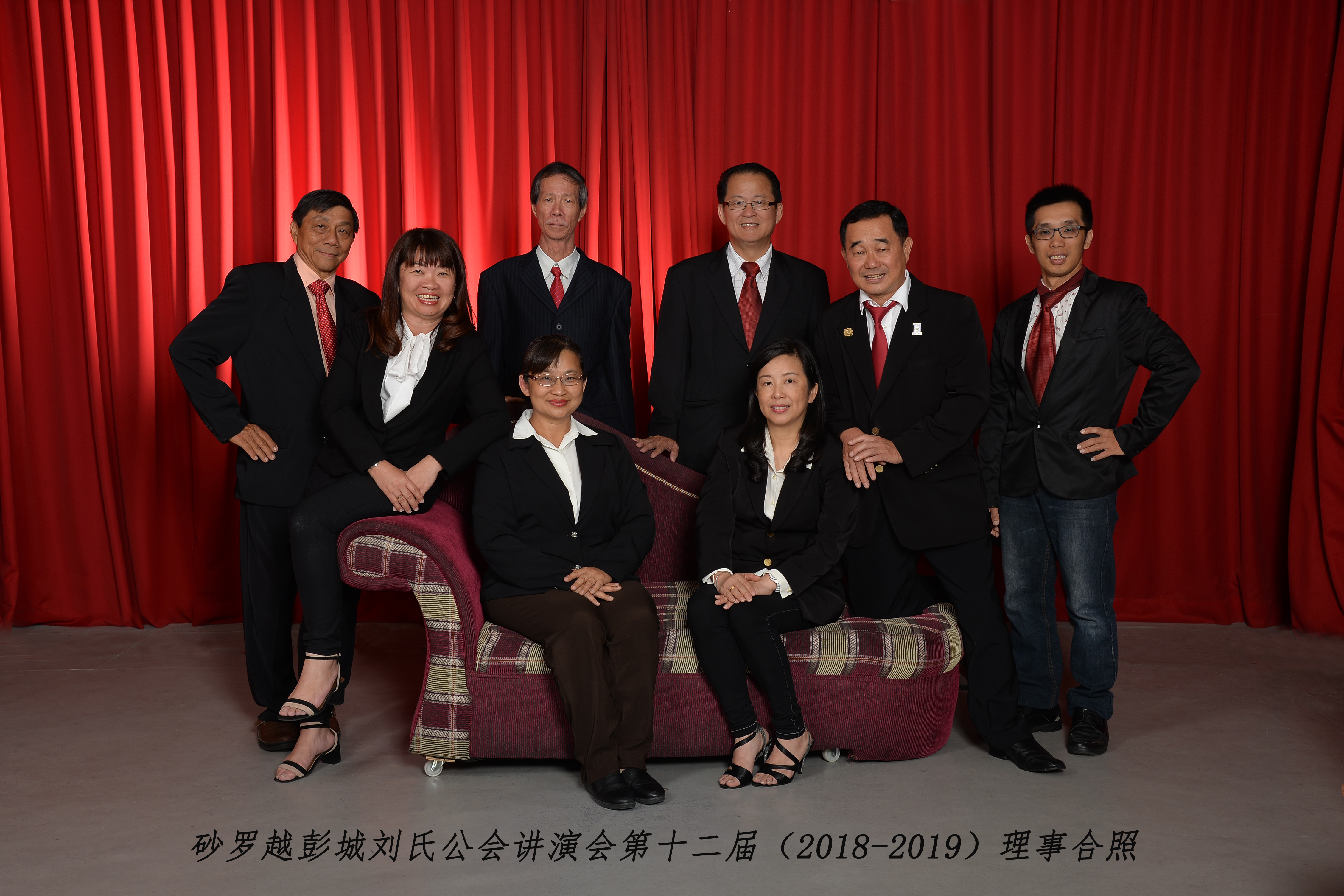 第十二届(2018-2019)讲演会理事合照。前排中为本会主席刘伯举、左右4 为本会秘书兼讲演会创会会长刘锦虎及讲演会会长黄惠娟。