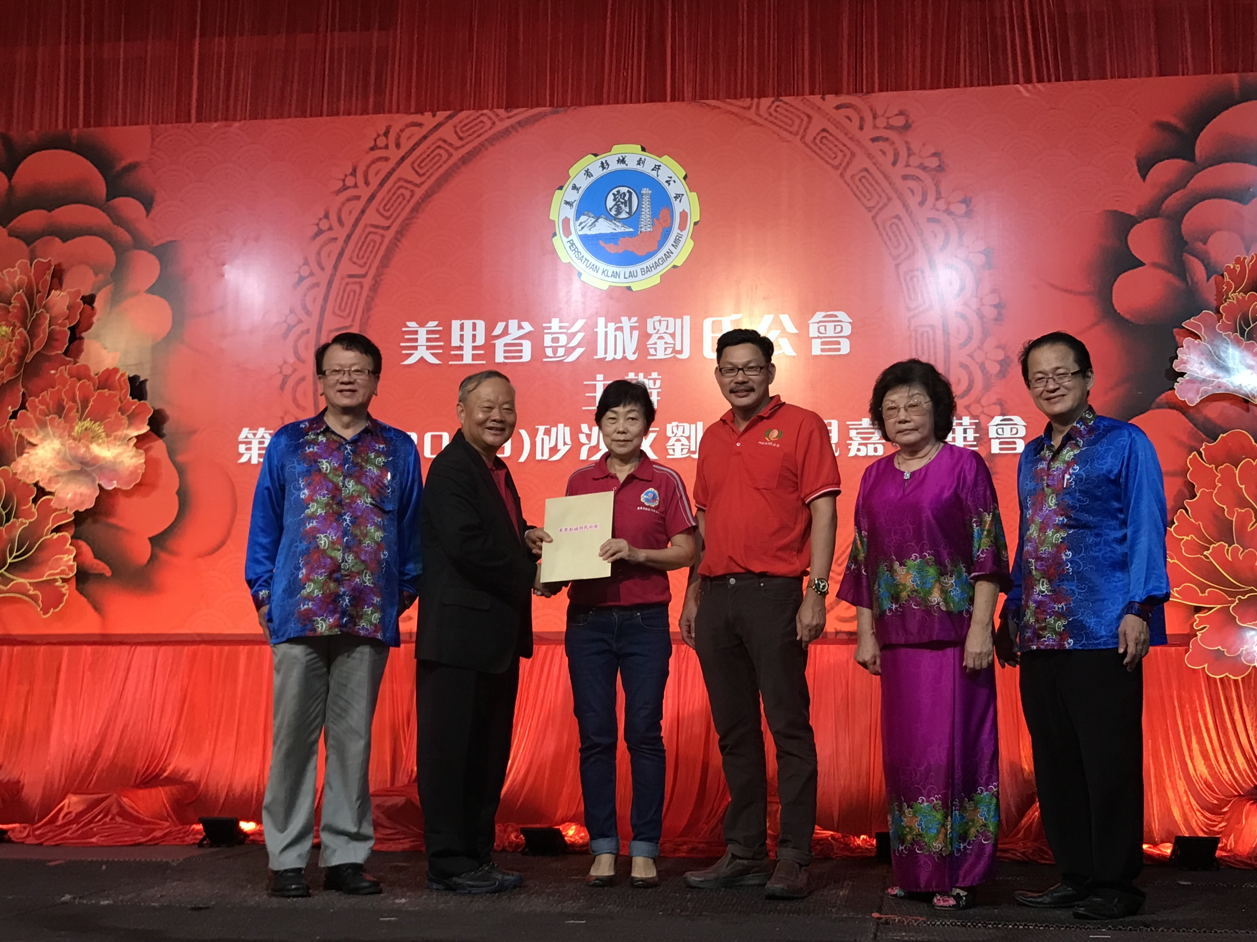 总会长拿督斯里久健宗长颁发第16届全砂常识比赛得奖者予泗里街彭城刘氏公会主席甲必丹刘贤敏主席接领。左起砂罗越彭城刘氏公会主席伯举宗长,砂刘总团长刘贤禄宗亲,砂罗越彭城刘氏公会妇女组主任甲必丹拿督刘文惠宗亲及青年团团长刘宜福宗亲。