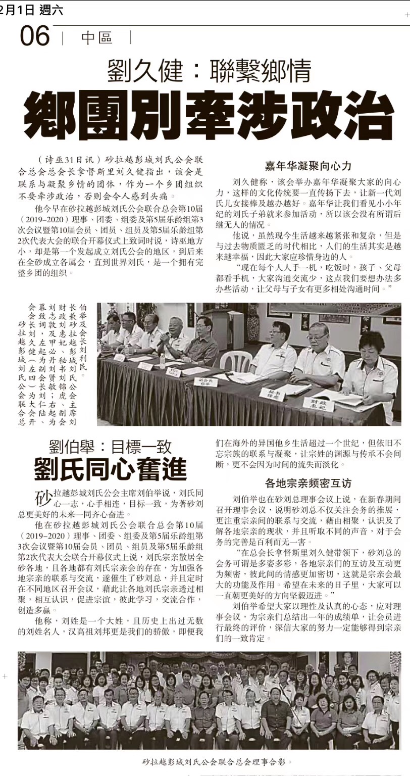觀察過去一年,有賴於領導團隊的努力付出與宗長、 宗親們的支持合作, 砂劉氏總會與各輔翼所有籌辦的活動都圓滿順利地舉行。