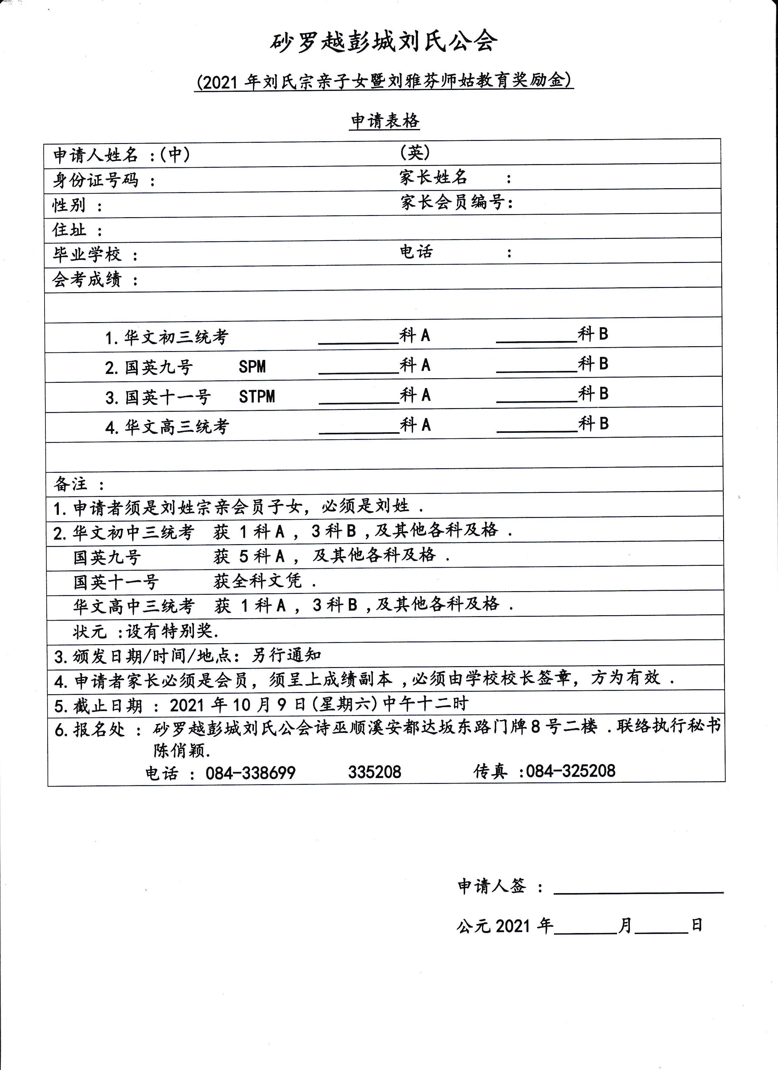 砂罗越彭城刘氏公会奖励金申请表格 Posted by admin | On 24 9 月,2021 | In 未分類 Related Posts 第五届【马来西亚刘氏宗亲常识比赛】暨 第十一届【砂拉越彭城刘氏宗亲常识比赛】中学组答案出炉--15/09/2013 【通告】砂罗越彭城刘氏公会青年团妇女组联合主办第29届砂沙汶彭城刘氏宗亲【嘉年华会】各组选拔赛比赛日期及时间表---22-23.08.2015 署理主席县议员恭福宗长获得砂羅越州元首敦丕顯斯里哈志阿都泰益瑪目颁发JBK勋衔-19/01/2022 About Author admin Leave a Reply發佈留言必須填寫的電子郵件地址不會公開。 必填欄位標示為 *顯示名稱 * 電子郵件地址 * 個人網站網址 在瀏覽器中儲存顯示名稱、電子郵件地址及個人網站網址,以供下次發佈留言時使用。 Δ