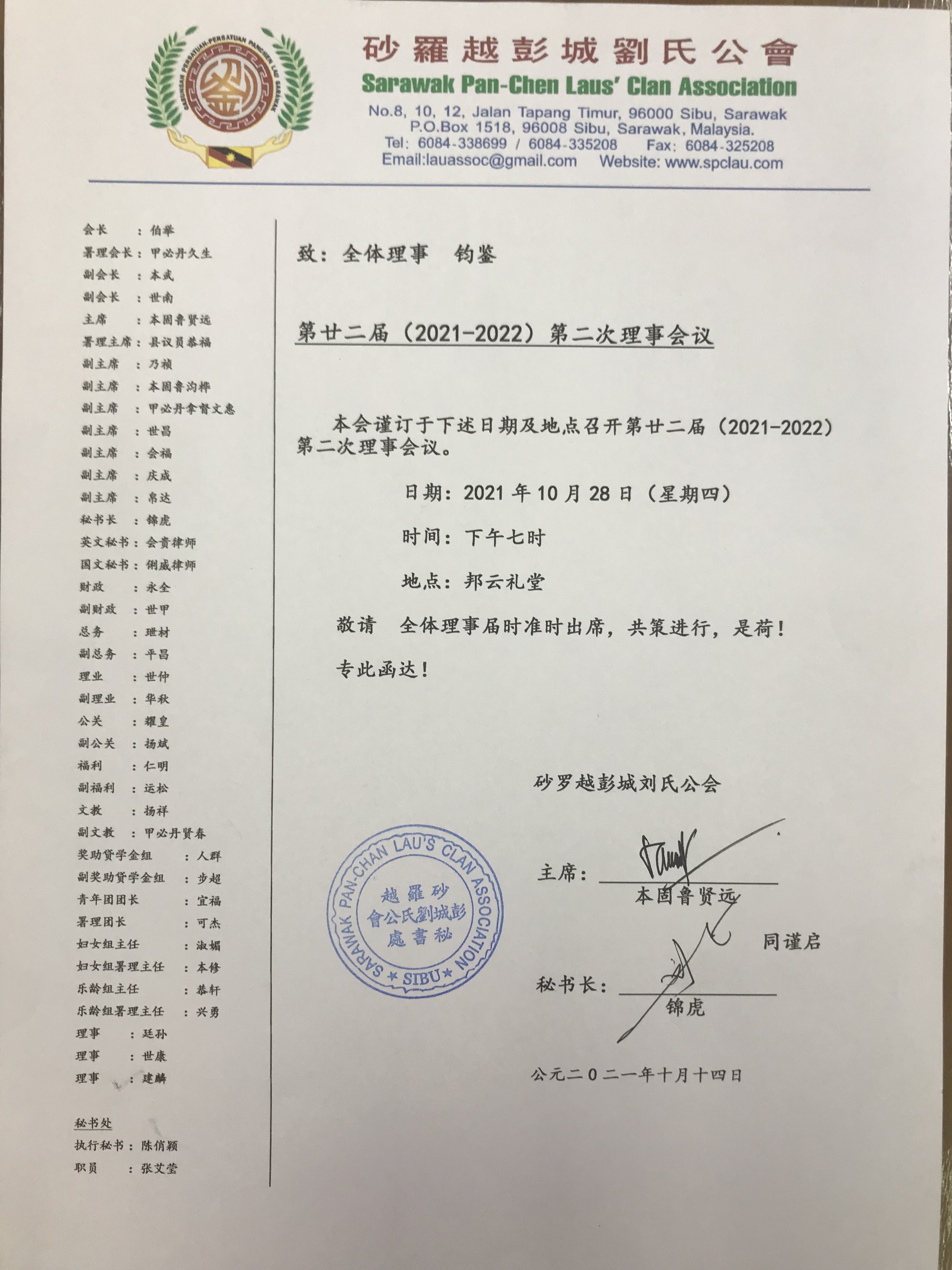 砂罗越彭城刘氏公会第廿二届(2021-2022)第一次理事会议通知书--28-10-2021 Posted by admin | On 18 10 月,2021 | In 未分類 Related Posts 砂罗越彭城刘氏公会第35届砂沙汶彭城刘氏宗亲【嘉年华会】--书法组选拔赛--20-8-2023 砂罗越彭城刘氏公会讲演会第十届(2016-2017)会员大会暨新届理事选举--15-5-2016 {通告}砂罗越彭城刘氏公会青年团妇女组联合主办【孝亲节联欢会】-7/5/2011 About Author admin Leave a Reply發佈留言必須填寫的電子郵件地址不會公開。 必填欄位標示為 *顯示名稱 * 電子郵件地址 * 個人網站網址 在瀏覽器中儲存顯示名稱、電子郵件地址及個人網站網址,以供下次發佈留言時使用。 Δ