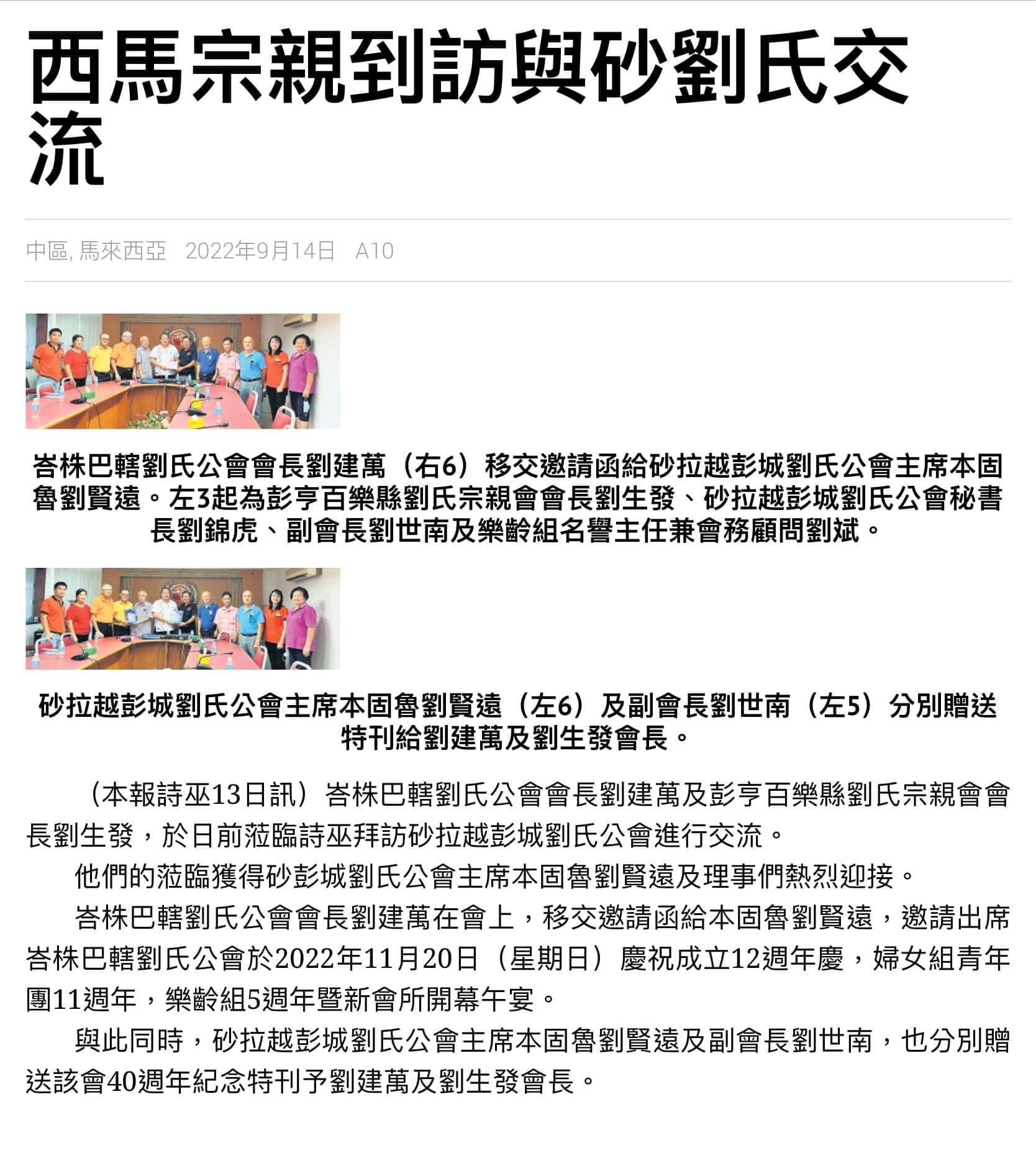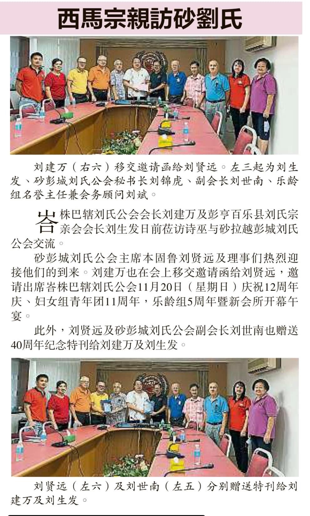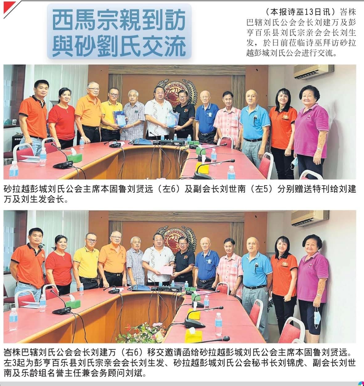 峇株吧辖刘氏公会会长刘建万及彭亨百乐县刘氏宗亲会会长刘生发於9月12日莅临诗巫参加砂罗越彭城刘氏公会主办.青年团妇女组及乐龄组协办【敬老会,中秋节及福利基金推展礼】午宴并拜访砂罗越彭城刘氏公会进行交流,受到该会主席本固鲁刘贤远及理事们热烈迎接。会上峇株吧辖刘氏公会会长刘建万移交邀请函给该会主席本固鲁刘贤远,并邀请出席峇株吧辖刘氏公会於2022年11月20日(星期日)庆祝12周年庆,妇女组青年团11周年,乐龄组5周年暨新会所开幕午宴。