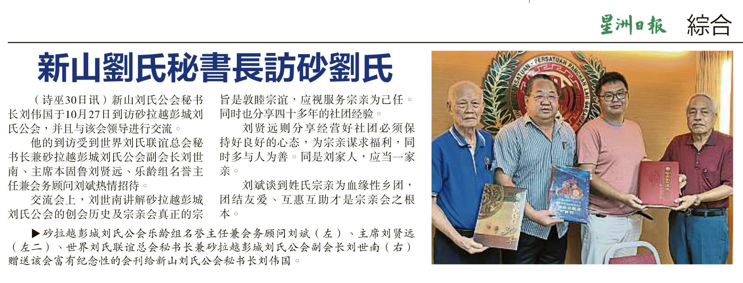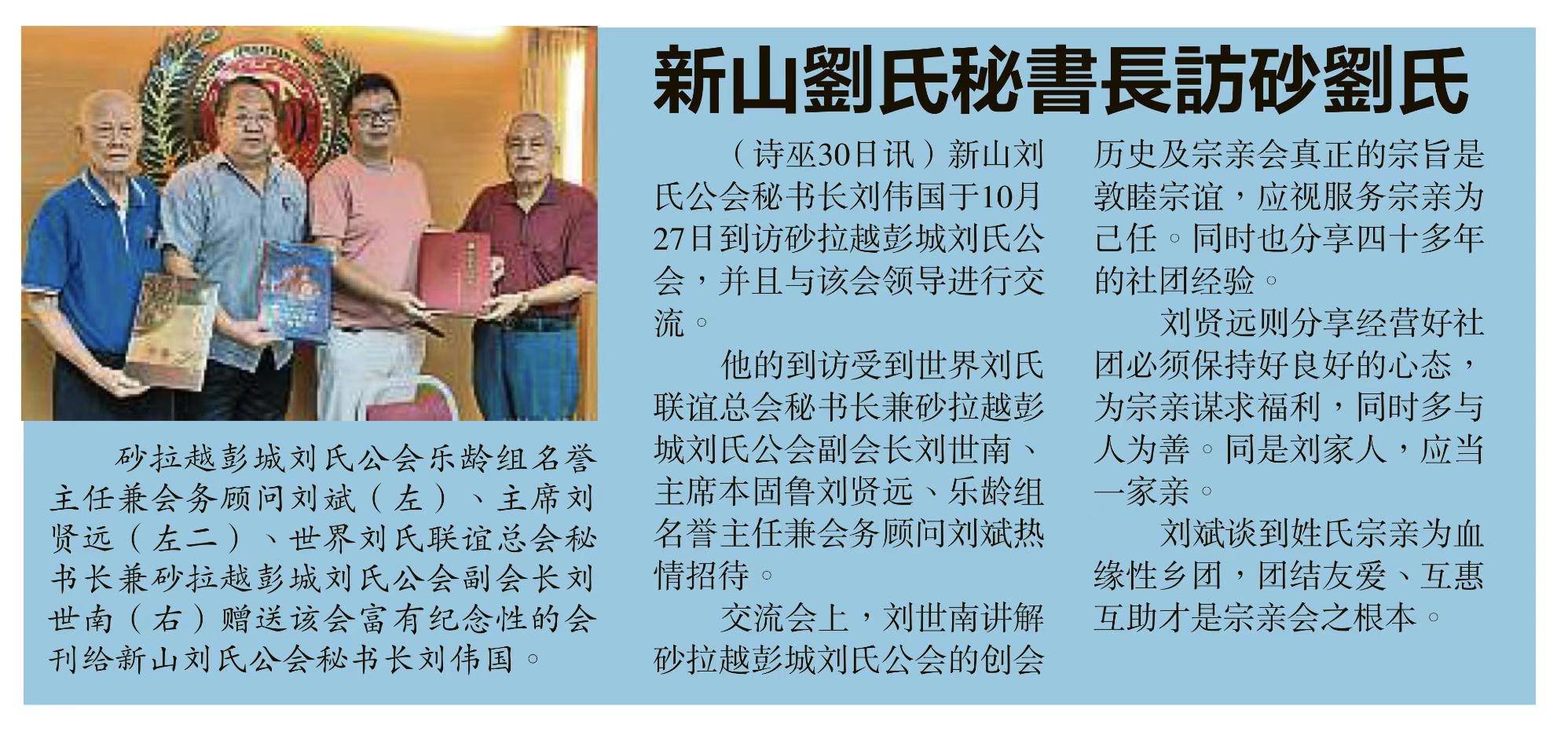 新山刘氏公会秘书长伟国拜访交流会--27-10-2022 Posted by admin | On 31 10 月,2022 | In 未分類 Related Posts 砂罗越彭城刘氏公会青年团妇女组联合主持2012年度新春联欢会暨砂刘总会第一届乐龄组就职典礼--27-1-2012 马来西亚刘氏总会主催 马来西亚刘氏总会青年团妇女组联合主办 砂罗越彭城刘氏公会青年团妇女组联合协办 第一届(2014)马来西亚刘氏宗亲【嘉年华会】保龄球比赛--22.03.2014 马来西亚刘氏总会青年团妇女组联合主催。森美兰刘氏公会青年团妇女组联合主办。砂罗越彭城刘氏公会青年团妇女组联合协办《爱心捐血运动》--13-10-2012 About Author admin Leave a Reply發佈留言必須填寫的電子郵件地址不會公開。 必填欄位標示為 *顯示名稱 * 電子郵件地址 * 個人網站網址 在瀏覽器中儲存顯示名稱、電子郵件地址及個人網站網址,以供下次發佈留言時使用。 Δ