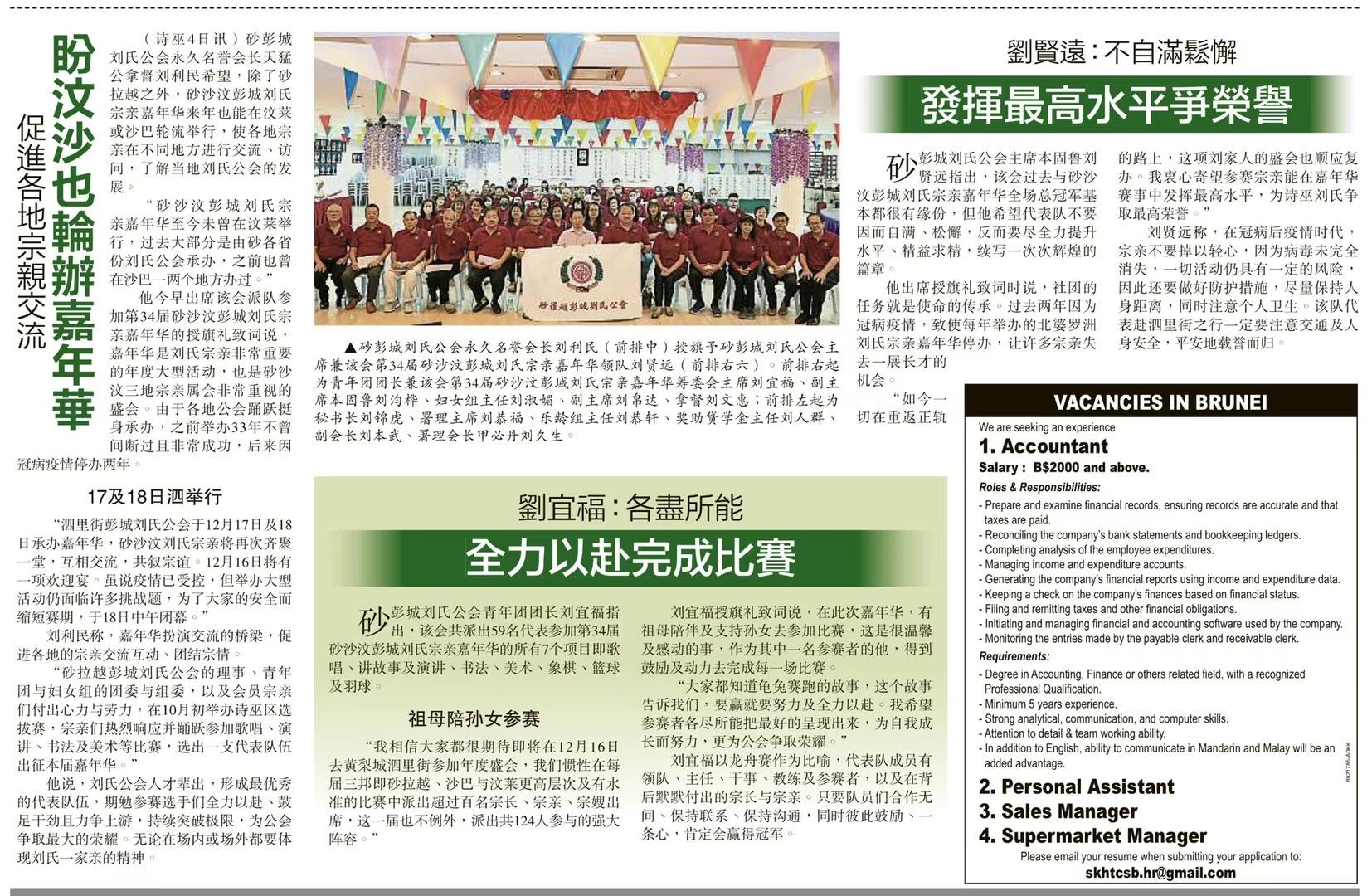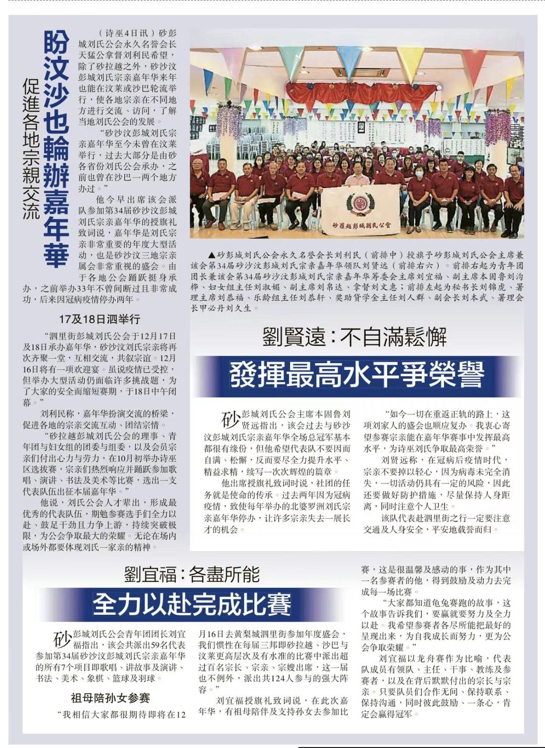 我也很高興看到宗親們熱烈響應並踴躍參加歌唱、演講、書法及美術等比賽,成功選出了一支代表隊伍出征第34屆(2022)砂沙汶彭城劉氏宗親嘉年華。