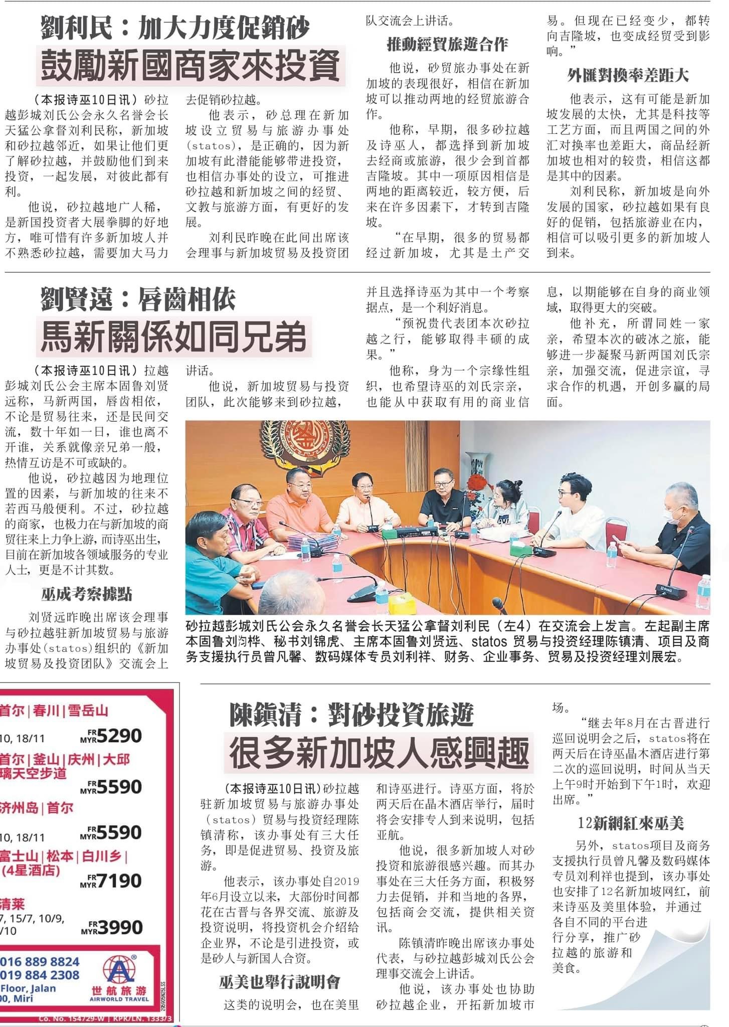 他說,很多新加坡人對砂投資和旅游很感興趣。而其辦事處在三大任