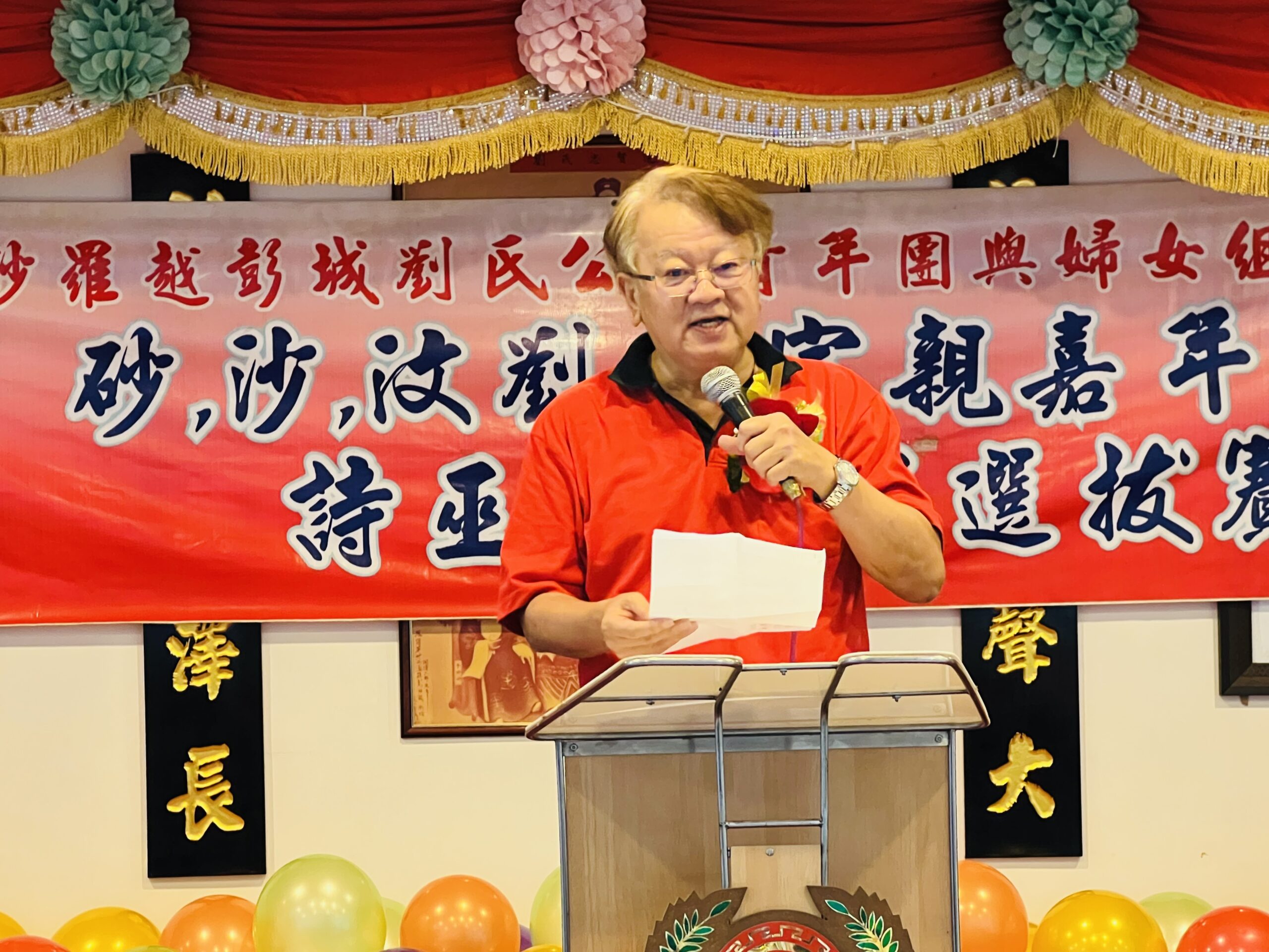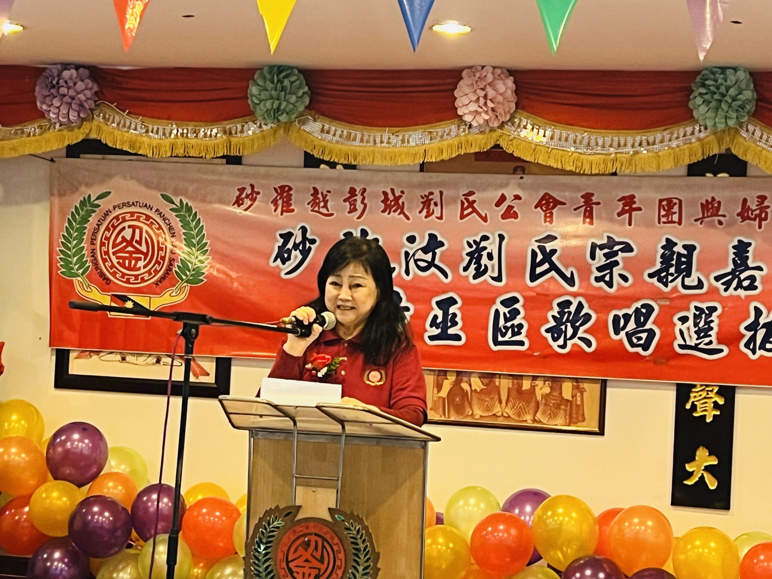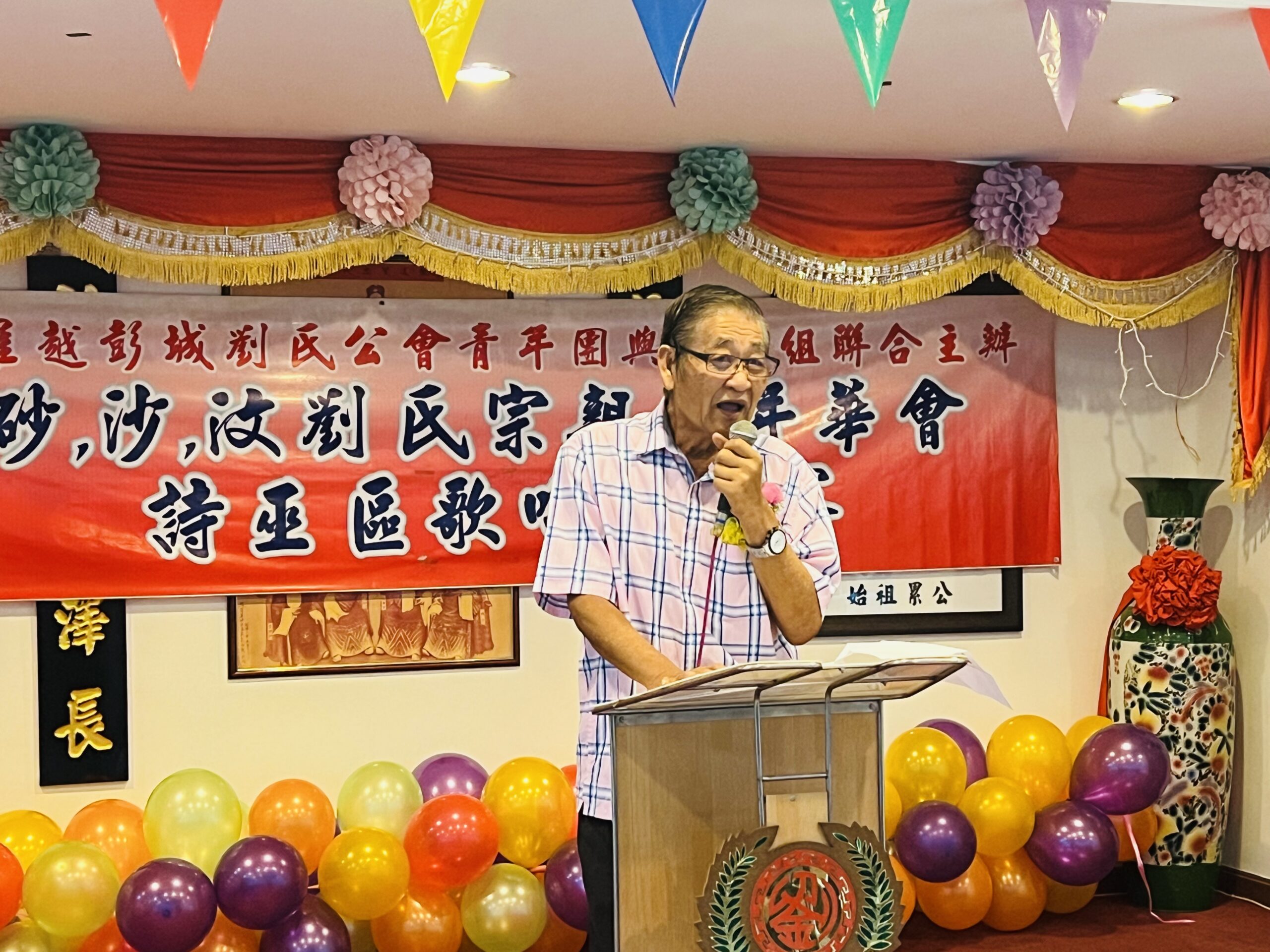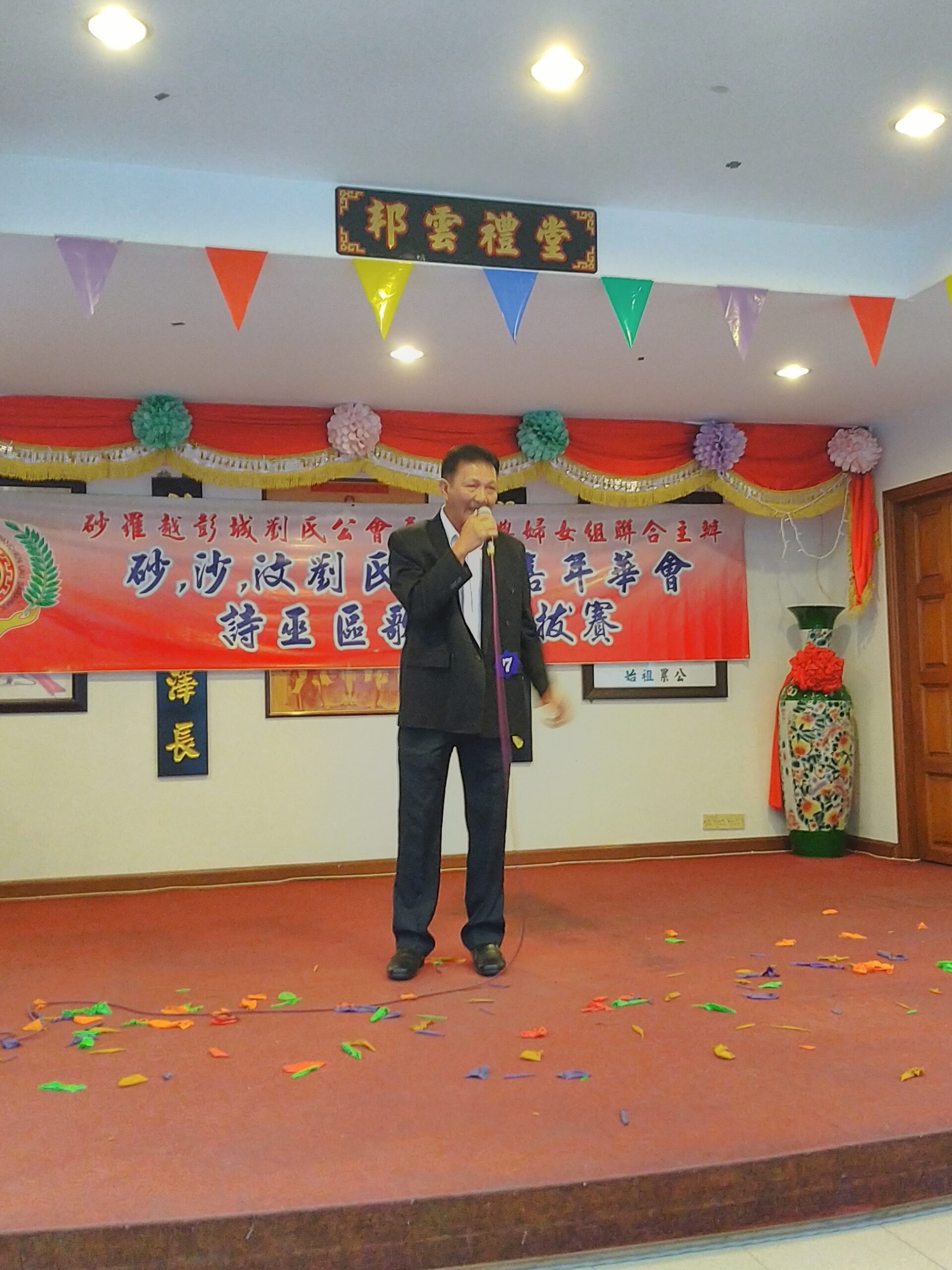 让我代表筹委会,歌唱组负责人,热烈欢迎各组别宗亲歌手参与,能使选拔顺利进行,选出优秀宗亲,为本会代表出席今年底,在马拉端刘氏公会所主办的第三十五届,砂、沙、汶刘氏宗亲[嘉年华会]歌唱组代表。