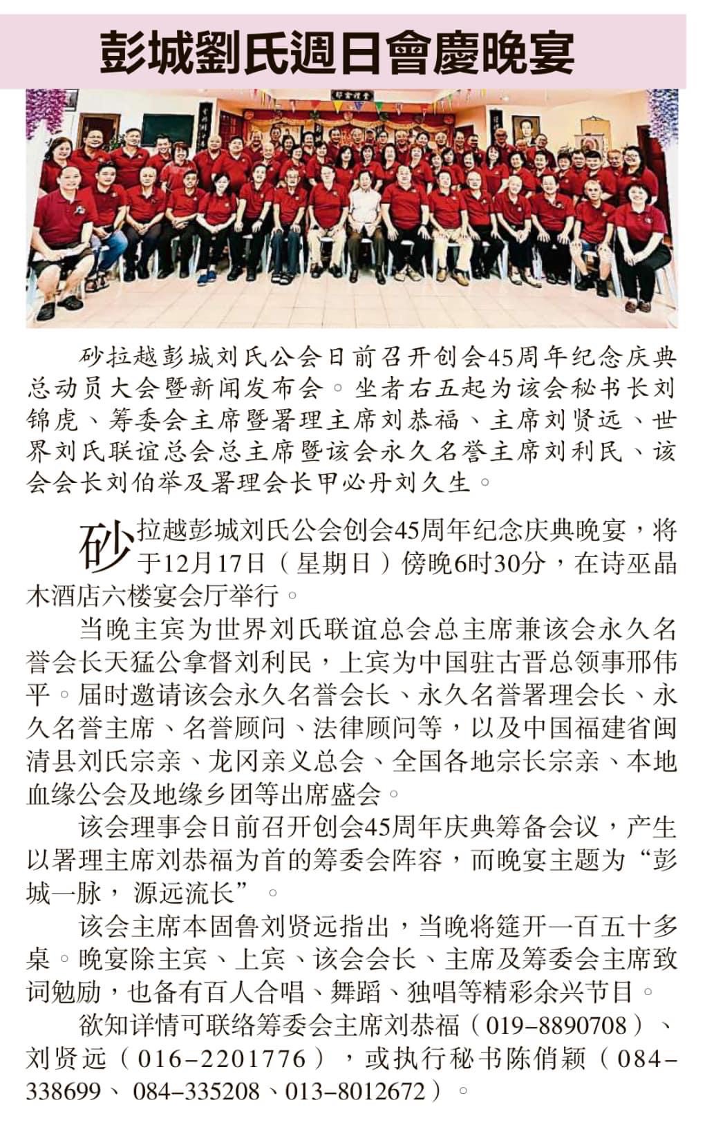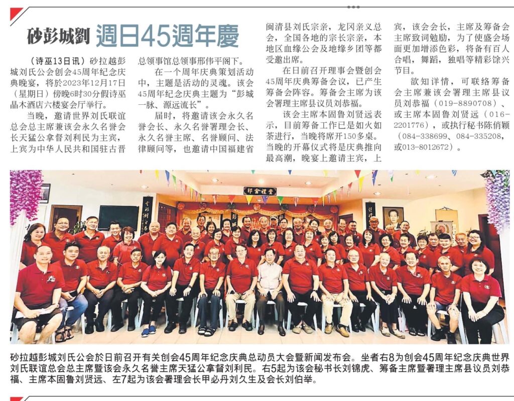 砂罗越彭城刘氏公会创会45周年纪念庆典总动员大会新闻发布会--12-12-2023 Posted by admin | On 13 12 月,2023 | In 未分類 砂罗越彭城刘氏公会於日前召开有关创会45周年纪念庆典 总动员大会暨新闻发布会;坐者右八为创会45周年纪念庆 典主宾世界刘氏联谊总会总主席暨该会永久名誉主席天猛 公拿督刘利民。右五起为该会秘书长刘锦虎,筹备主席暨署 理主席县议员刘恭福,主席本固鲁刘贤远。左七起为该会署 理会长甲必丹刘久生及会长刘伯举。 Related Posts 【通告】砂罗越彭城刘氏公会讲演会主办【会内幽默演讲及讲评比赛】筹备会阵容及程序表--25-9-2011 砂罗越彭城刘氏公会常年会员大会暨新春联欢会--05/02/2014 {通告}砂罗越彭城刘氏公会第五届(2011)讲演会会员大会3-5-2011 About Author admin Leave a Reply發佈留言必須填寫的電子郵件地址不會公開。 必填欄位標示為 *顯示名稱 * 電子郵件地址 * 個人網站網址 在瀏覽器中儲存顯示名稱、電子郵件地址及個人網站網址,以供下次發佈留言時使用。 Δ