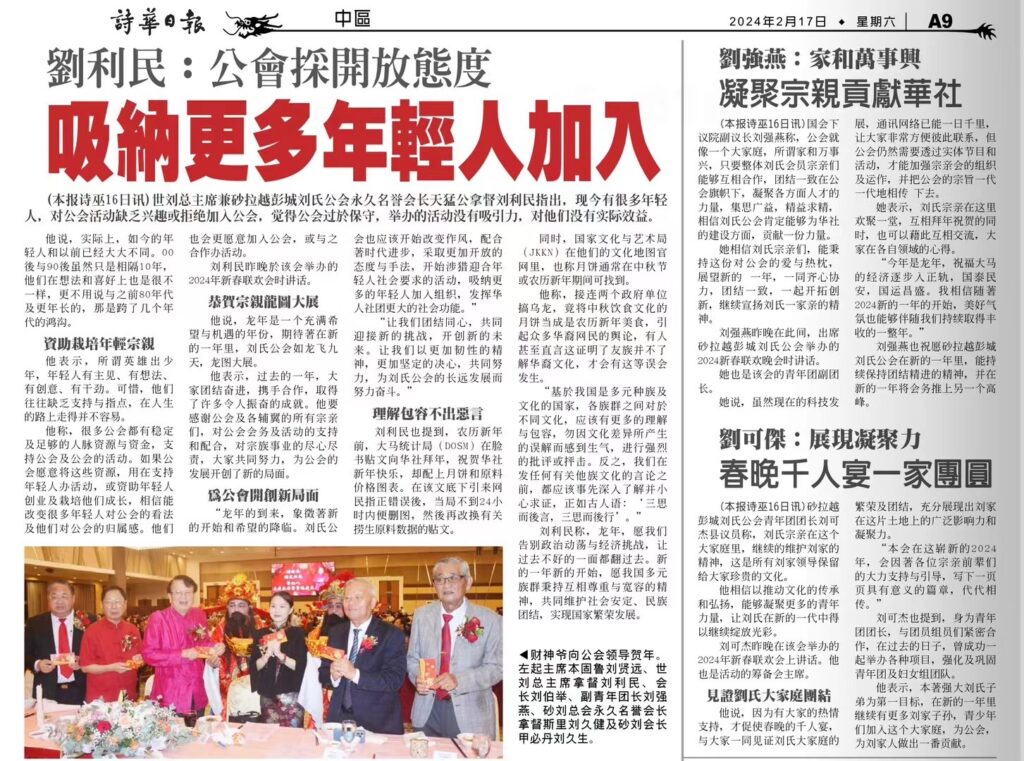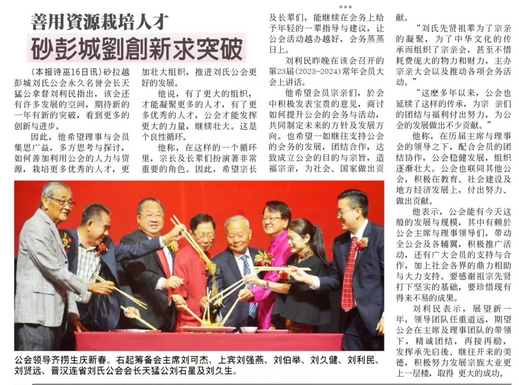 他说,春节是华人传统节日中最为重要的,许多在外拚搏的游子都会想方设法回家,与家人团聚,除了卸下一年的辛劳,更希望借着新春的吉祥时刻,在家人及亲友的祝福下,继续取得更为丰硕的成果。砂刘总会的相聚亦是一种团圆,希望凝聚全砂刘氏的力量,继续壮大该会,为更多宗亲服务及谋福利。