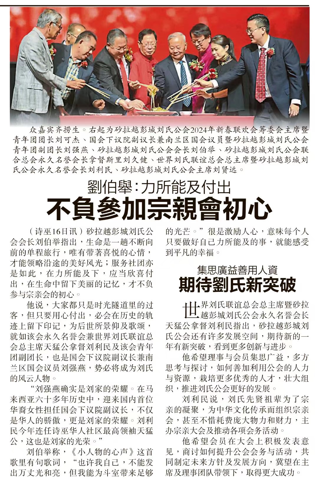 “我相信刘氏宗亲们能秉持这份对公会的爱与热枕,展望新的一年,齐心协力、团结一致,齐开拓创新,继续宣扬刘氏一家亲的精神。