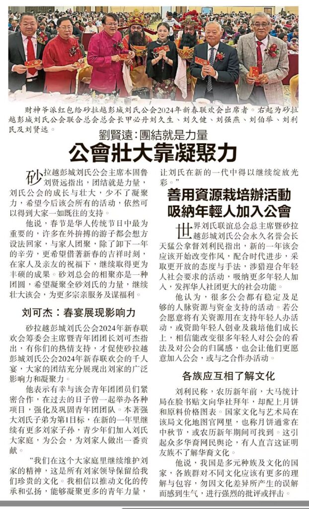 刘贤远出席砂拉越彭城刘氏公会2024年新春联欢会致词时指出,最艰难时刻已经过去,希望甲辰龙年里,刘氏宗亲们都健康平安,寄望龙的威严可以驱散所有的不如意,为大家带来更加祥和及舒适的生活环境。