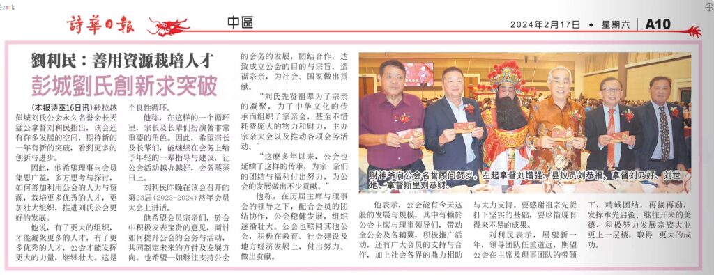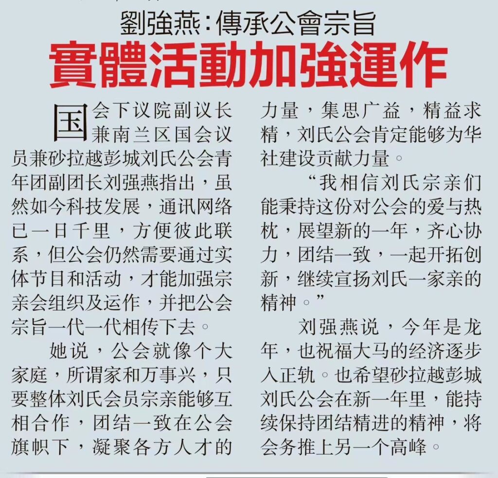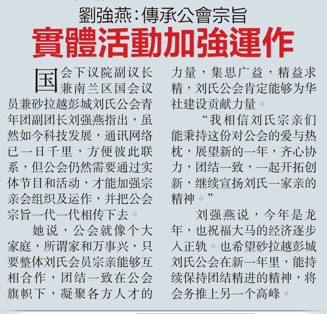 刘强燕说,今年是龙年,也祝福大马的经济逐步入正轨。也希望砂拉越彭城刘氏公会在新一年里,能持续保持团结精进的精神,将会务推上另一个高峰。
