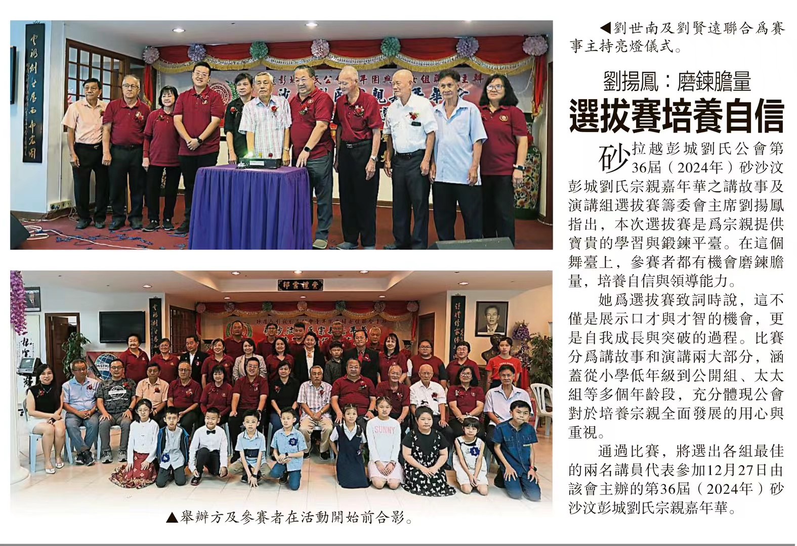 最后,预祝每一位参赛者都能在今天的比赛中发挥出色,取得优异的成绩。通过这次的参赛,将选出各组最佳的两位讲员代表参加12月27日由本会主办的第36届(2024)砂沙汶彭城刘氏宗亲嘉年华,无论比赛结果如何,你们都是最勇敢的,都是我们刘氏的骄傲。愿大家在比赛中享受过程,收获成长!