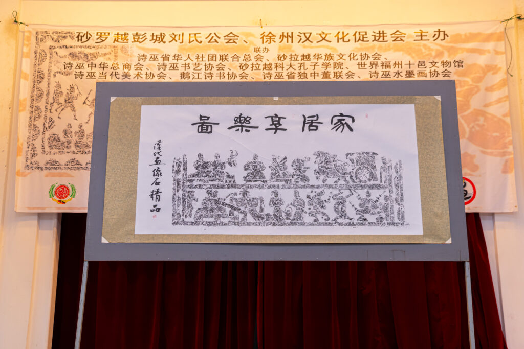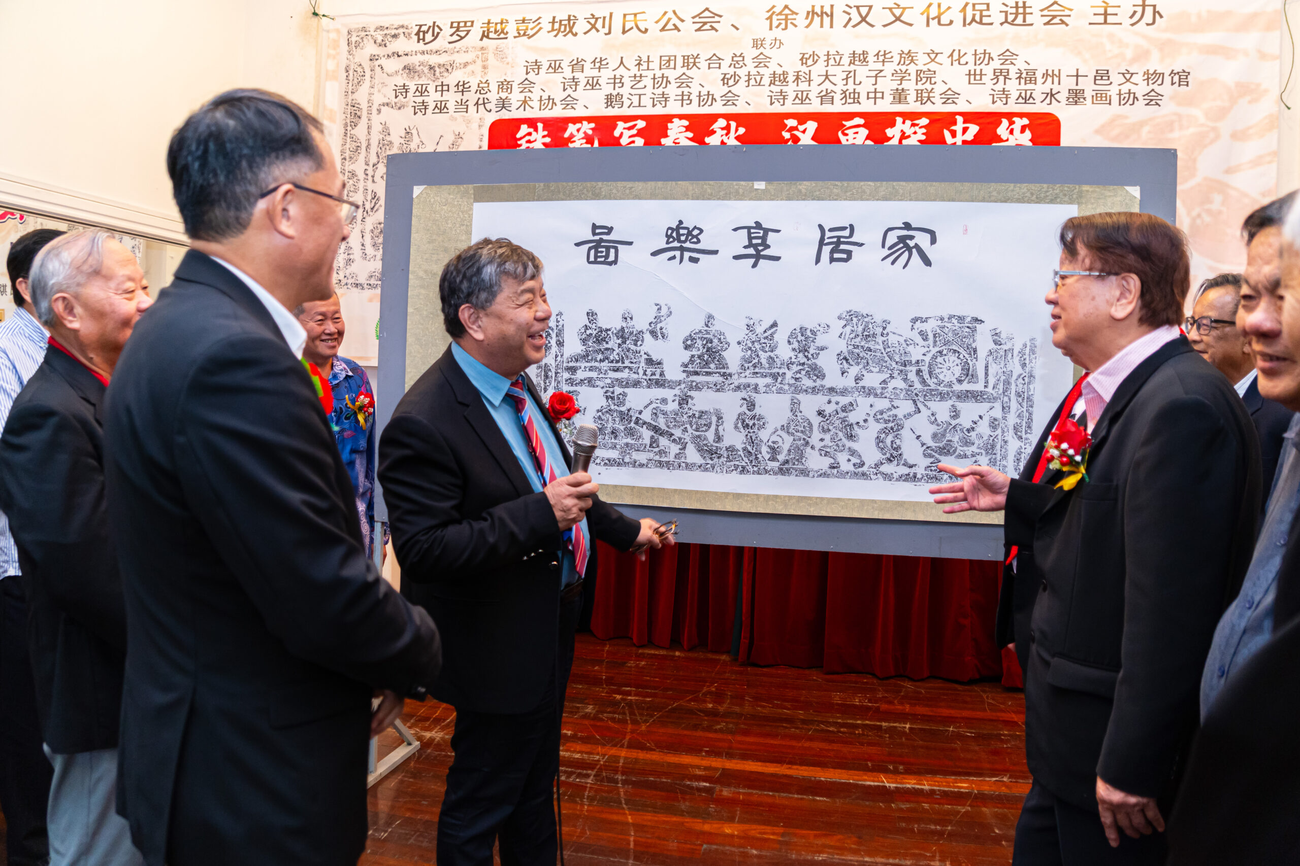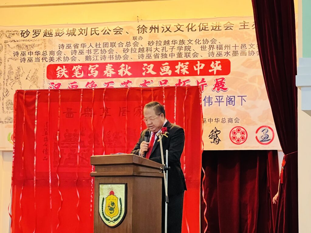 本会会长伯举宗长指出,汉画像石,穿越时空的文化瑰宝。汉画像石,作为汉代文化艺术的重要载体,展现了汉代社会的精神世界、生产生活和历史记忆。他说,它们以简练的线条、丰富的构图,生动地描绘出人们对生命、宇宙、神灵的理解和向往,是中国古代美术史上的珍贵财富。他在砂拉越彭城刘氏公会,徐州汉文化促进会主办,诗巫省华人社团联合总会,砂拉越华族文化协会,诗巫中华总商会,诗巫艺术协会,砂拉越科大孔子学院,世界福州十邑文物馆,诗巫当代美术协会,鹅江诗书协会,诗巫省独中董联会,诗巫水墨画协会联办铁笔写春秋, 汉画探中华,汉画像石艺求品拓片展开幕礼上致词时称,拓片作为汉画像石的重要延伸,将这些珍贵的历史图像以纸墨形式保留了下来。每一幅拓片都经过了技艺精湛的工匠精心拓制,既传承了历史的厚重感,也赋予了现代人欣赏与研究的便利。他提到,汉画像石所呈现的内容丰富多样,有庄重肃穆的礼仪场景,有反映农耕、狩猎、宴乐的生活场景,还有神话传说、飞天神兽等带有浪漫主义色彩的图像。这些作品线条道劲流畅,构图巧妙灵活,充分展现了汉代人民的艺术才华与审美追求。“今天的拓片展,将这些珍贵的历史艺术品重新呈现在大家面前。我们不仅能从中感受到汉代艺术的磅礴气势,还能领略到中国传统拓片技艺的精湛与独特。每一幅拓片,都是历史、文化与艺术的凝聚, 是前人智慧的结晶。”他指出,汉画像石艺术与拓片技艺,承载着深厚的文化底蕴,但随着时间的推移,部分石刻受到了自然和人为因素的侵蚀,保护和传承成为了我们这一代人的重要使命。“通过此次展览,我们希望让更多人了解汉画像石的艺术价值,唤起大家对文化遗产保护的重视,共同推动传统文化的传承与创新。
