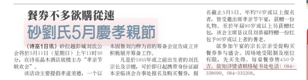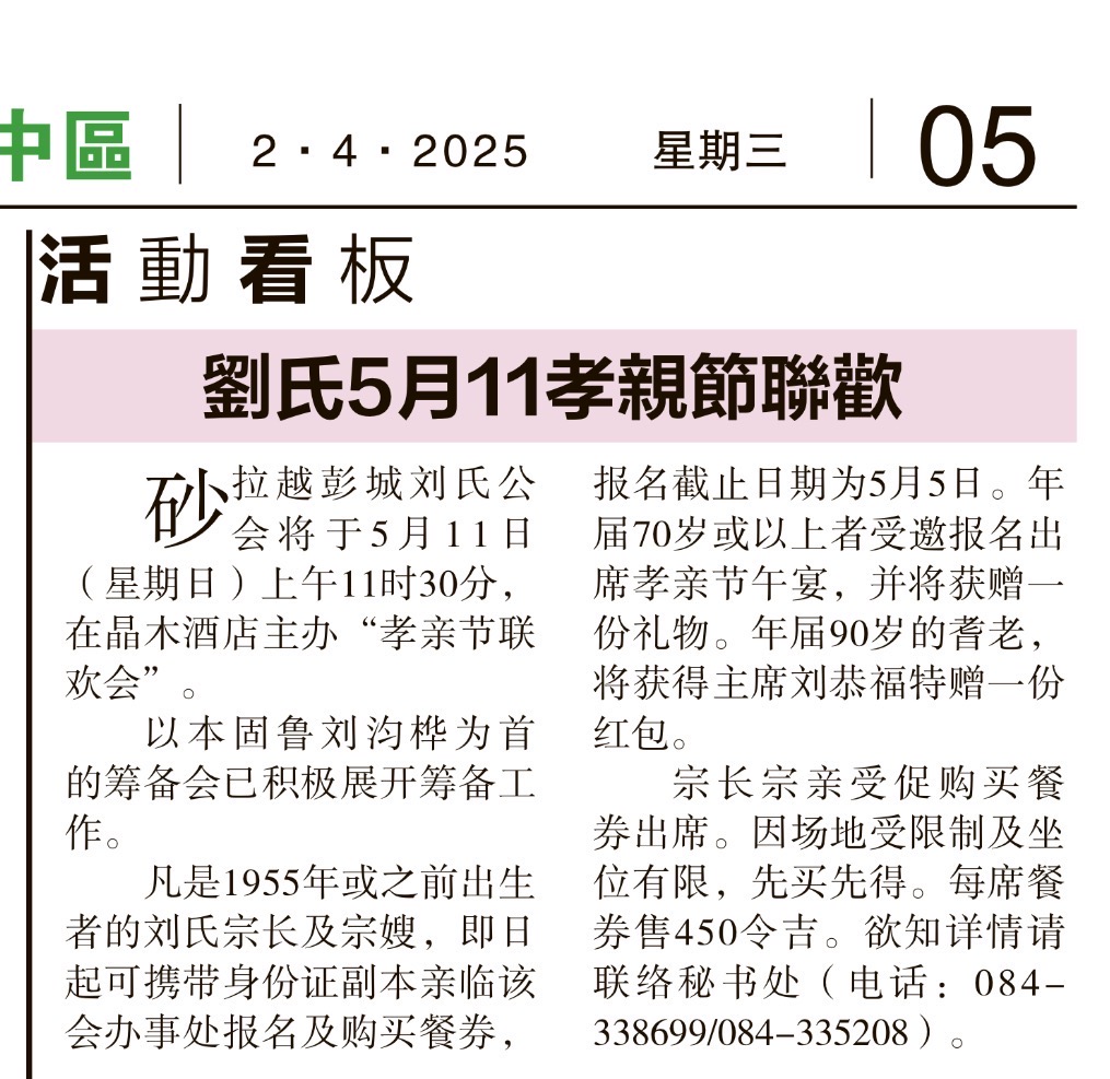 【通告】砂罗越彭城刘氏公会主办【孝亲节联欢会】-11-5-2025 Posted by admin | On 2 4 月,2025 | In 未分類 Related Posts 砂罗越彭城刘氏公会讲演会主办【会内幽默演讲及讲评比赛】--19-20/9/2017 砂罗越彭城刘氏公会慰劳宴兼常识比赛颁奖礼--13-12-2017 新山刘氏公会秘书长伟国拜访交流会--27-10-2022 About Author admin Leave a Reply發佈留言必須填寫的電子郵件地址不會公開。 必填欄位標示為 *顯示名稱 * 電子郵件地址 * 個人網站網址 在瀏覽器中儲存顯示名稱、電子郵件地址及個人網站網址,以供下次發佈留言時使用。 Δ
