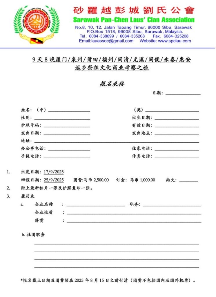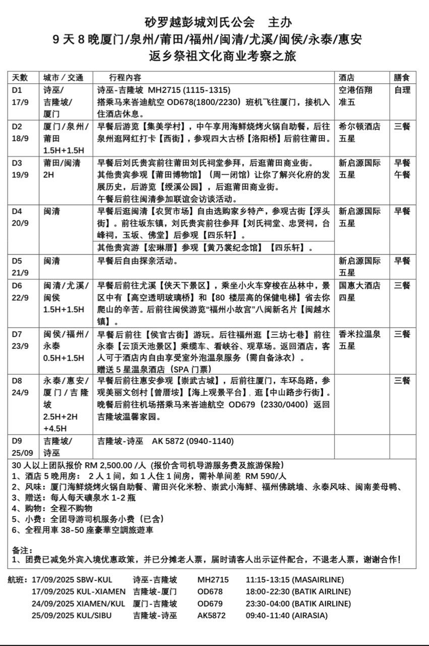 砂罗越彭城刘氏公会将于2025年9月17日至9月25日主办一项为期9天8晚的返乡祭祖文化商业考察之旅,路线涵盖中国福建多个历史名城及宗亲发源地,包括:厦门、泉州、莆田、福州、尤溪、闽侯、永泰、惠安、闽清。