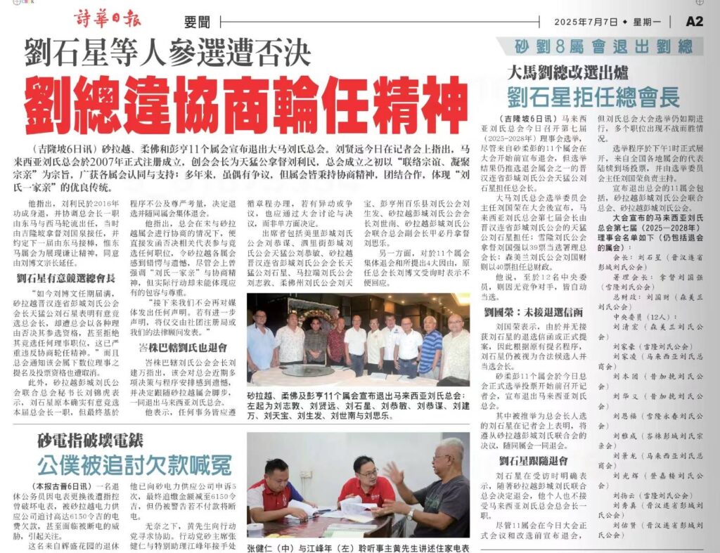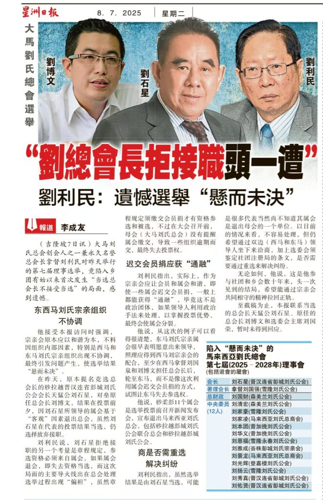 此外,砂罗越彭城刘氏公会联合总会秘书长刘锦虎表示,天猛公刘石星原本确实有意竞选本届总会长一职,但最终基於程序不公及尊严考量,决定退选并随同属会集体退会。