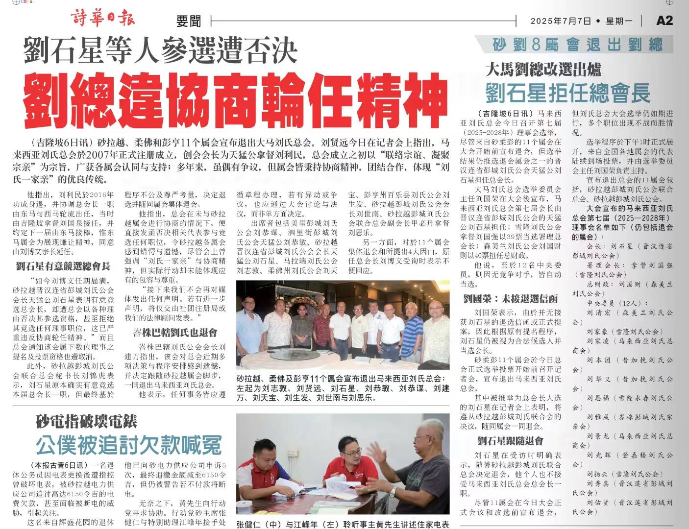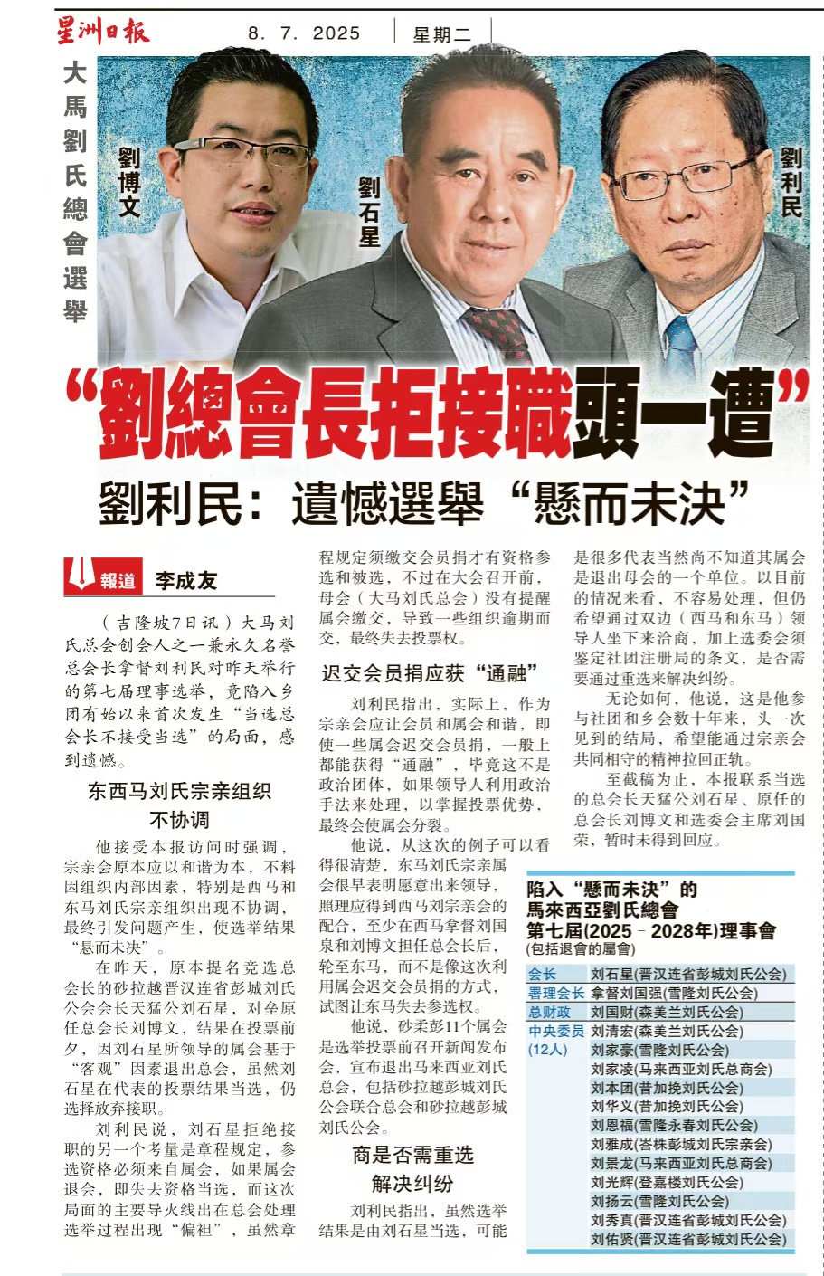 砂拉越、柔佛及彭亨11个属会宣布退出马来西亚刘氏总会-6-7-2025