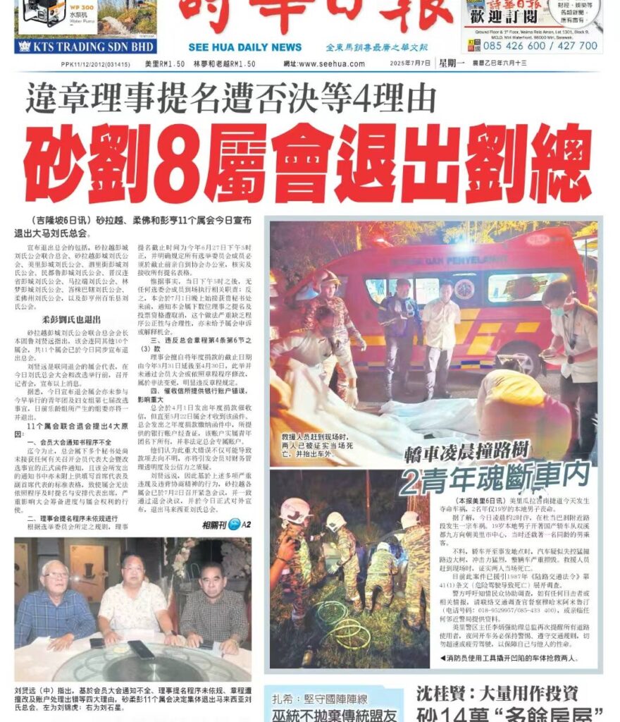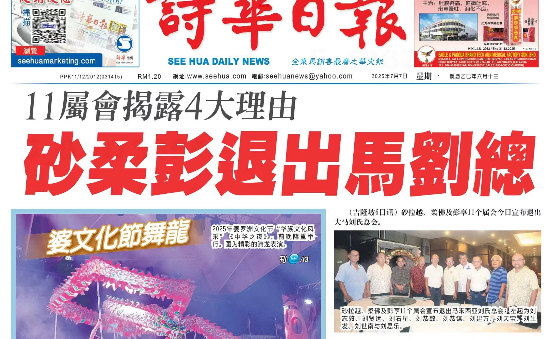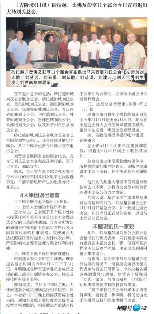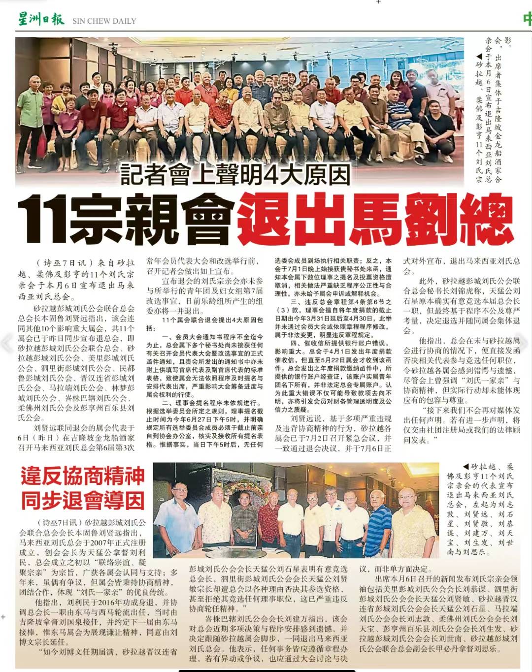 砂拉越、柔佛及彭亨11个属会於7月6日宣布退出马来西亚刘氏总会。