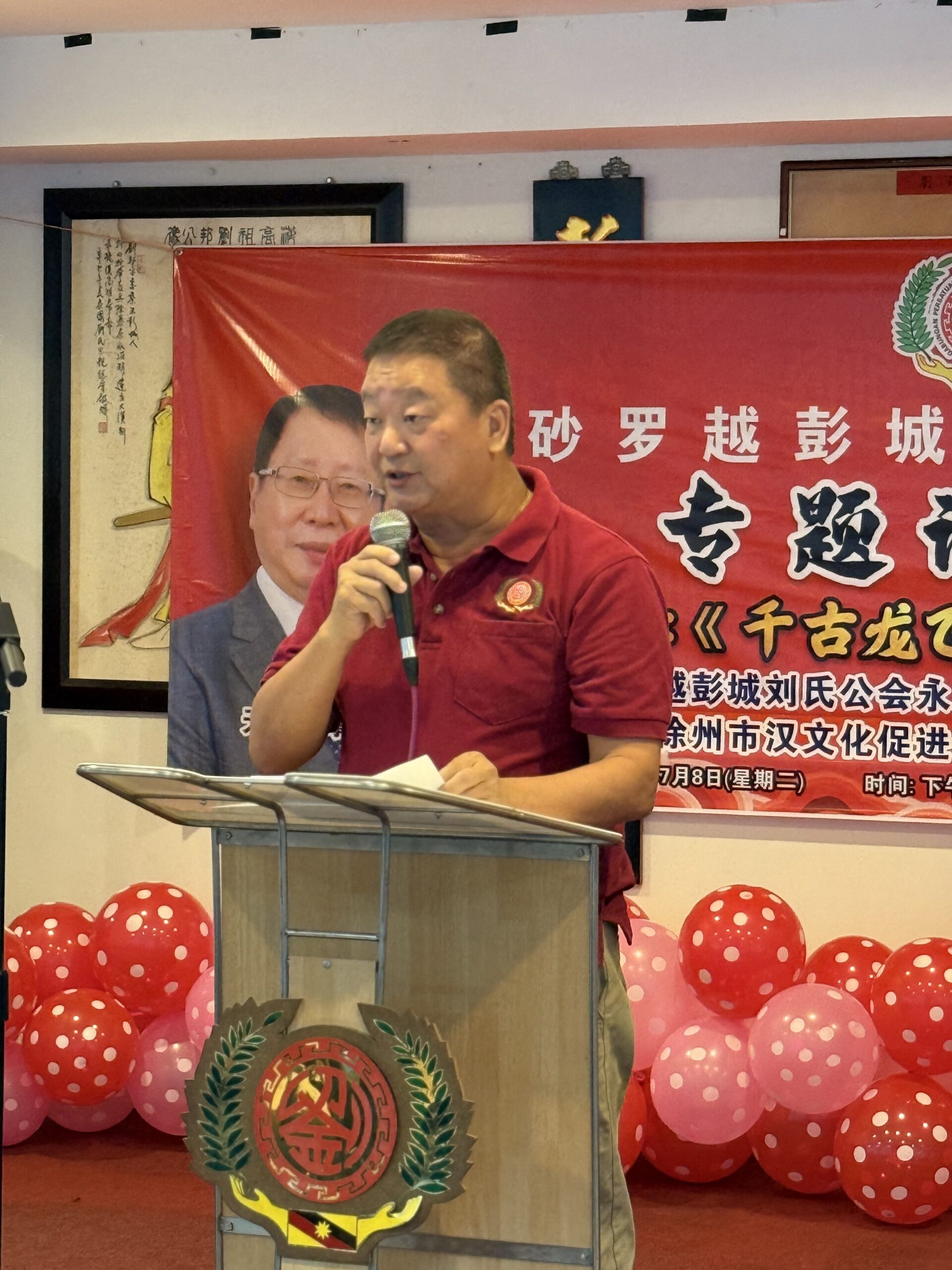 今天,砂罗越彭城刘氏公会有幸主办“千古龙飞地,雄豪大汉风”专题讲座,诚邀中国徐州汉文化促进会副会长、江苏师范大学赵明奇教授亲临主讲。在此,我谨代表刘氏公会全体同仁,向赵教授致以最诚挚的敬意,向莅临的各位宗亲及嘉宾表示热烈欢迎!