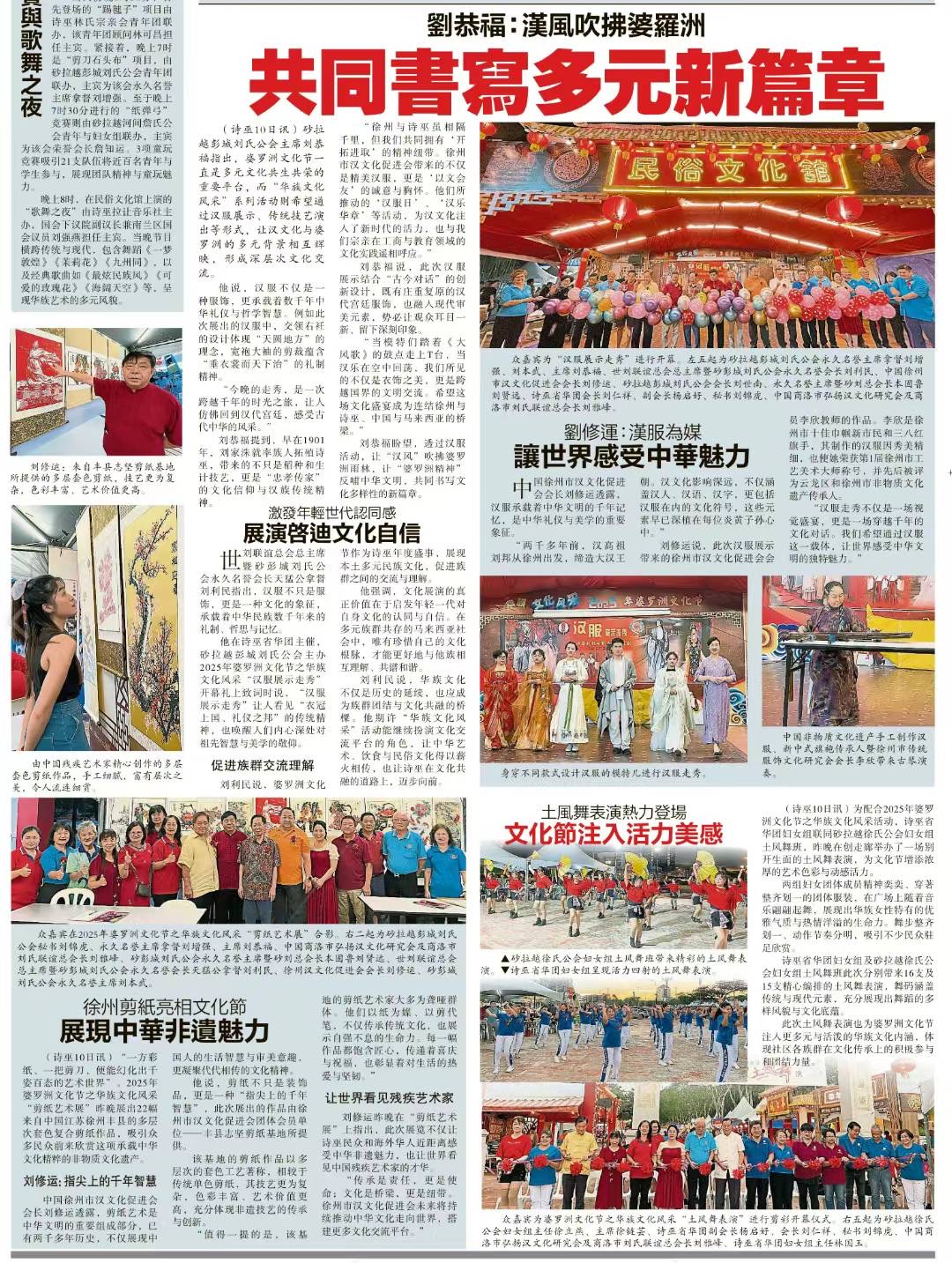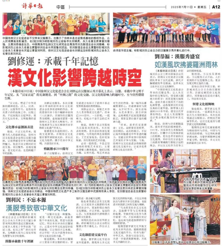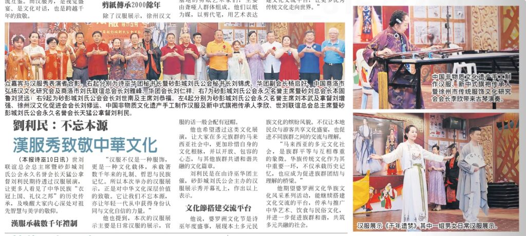 今日,当徐州汉文化促进会的汉服团队踏上这片土地,他们带来的不仅是汉代直裾、唐代齐胸襦裙的华美展演,更是汉文化“以文会友”的胸怀。正如徐州近年通过“汉服日”,“汉乐华章”等活动推动传统服饰“出圈”,我们砂罗越刘氏宗亲也在工商、教育领域践行“敦睦宗谊〞的理念,从诗巫福州垦场的稻香到现代都市的科技之光,汉文化始终是我们安身立命的精神根基。