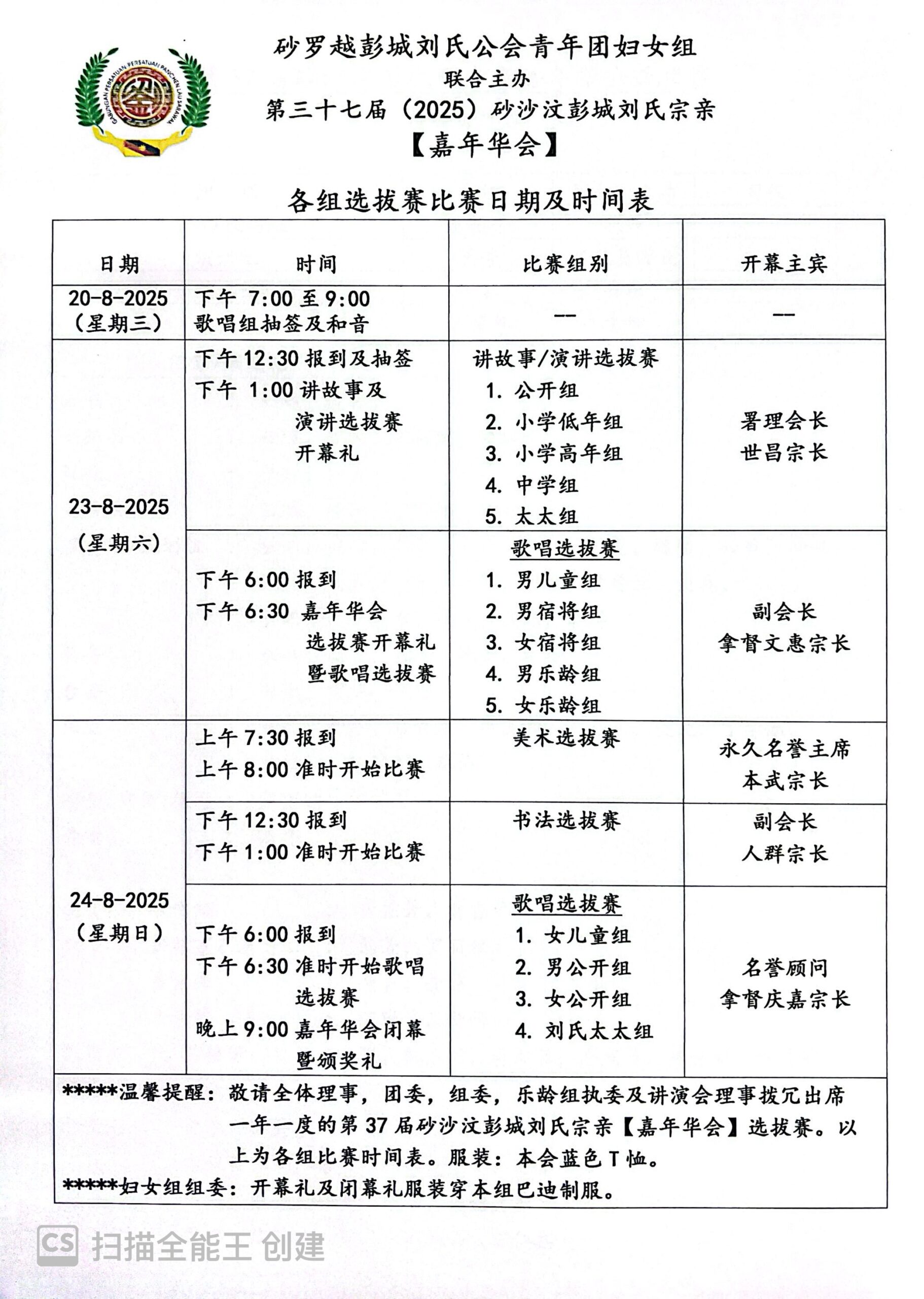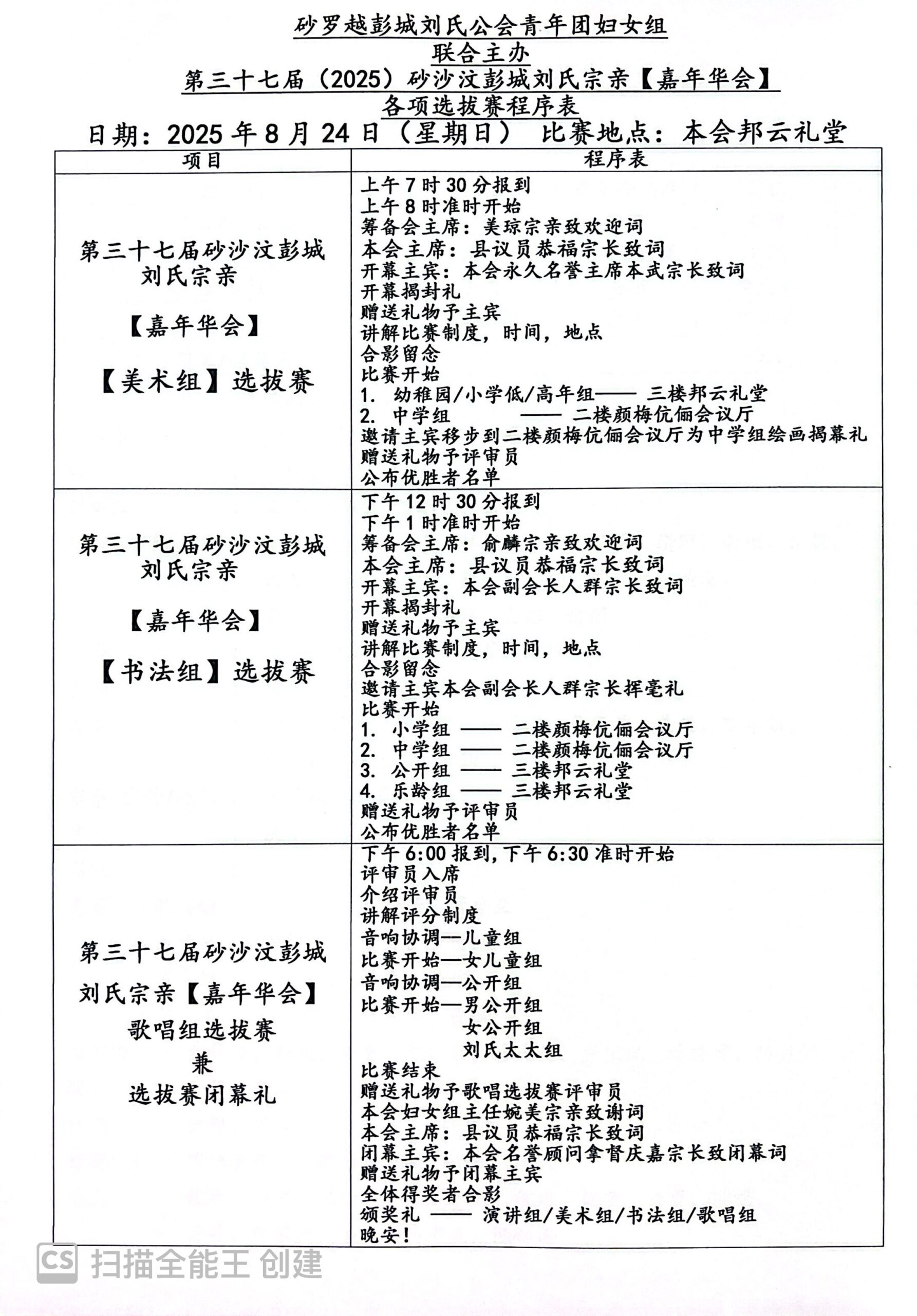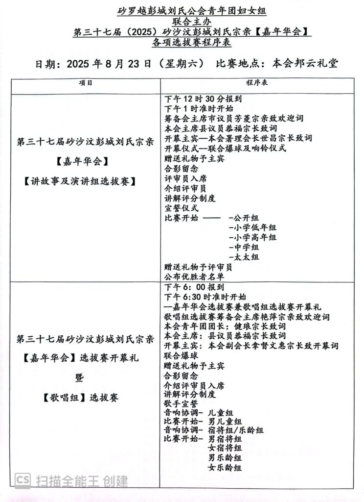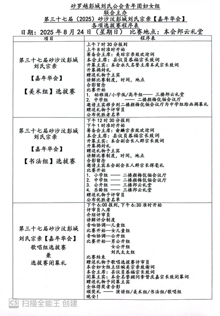 砂罗越彭城刘氏公会青年团与妇女组联合主办第37届砂沙汶彭城刘氏宗亲【嘉年华会】各组选拔赛程序表--23-24/8/2025 Posted by admin | On 21 8 月,2025 | In 未分類 Related Posts 砂罗越彭城刘氏公会創會40週年(1978-2018)慶典暨砂罗越彭城刘氏公会联合总会創會20週年(2000-2018)慶典半日游-10-11-2018 马来西亚刘氏总会青年团妇女组联合主催。雪隆刘氏公会青年团妇女组联合主办。砂罗越彭城刘氏公会青年团妇女组联合协办【爱心捐血运动】--18-10-2015 砂罗越彭城刘氏公会第十八届【2013-2014】理事 About Author admin Leave a Reply發佈留言必須填寫的電子郵件地址不會公開。 必填欄位標示為 *顯示名稱 * 電子郵件地址 * 個人網站網址 在瀏覽器中儲存顯示名稱、電子郵件地址及個人網站網址,以供下次發佈留言時使用。 Δ