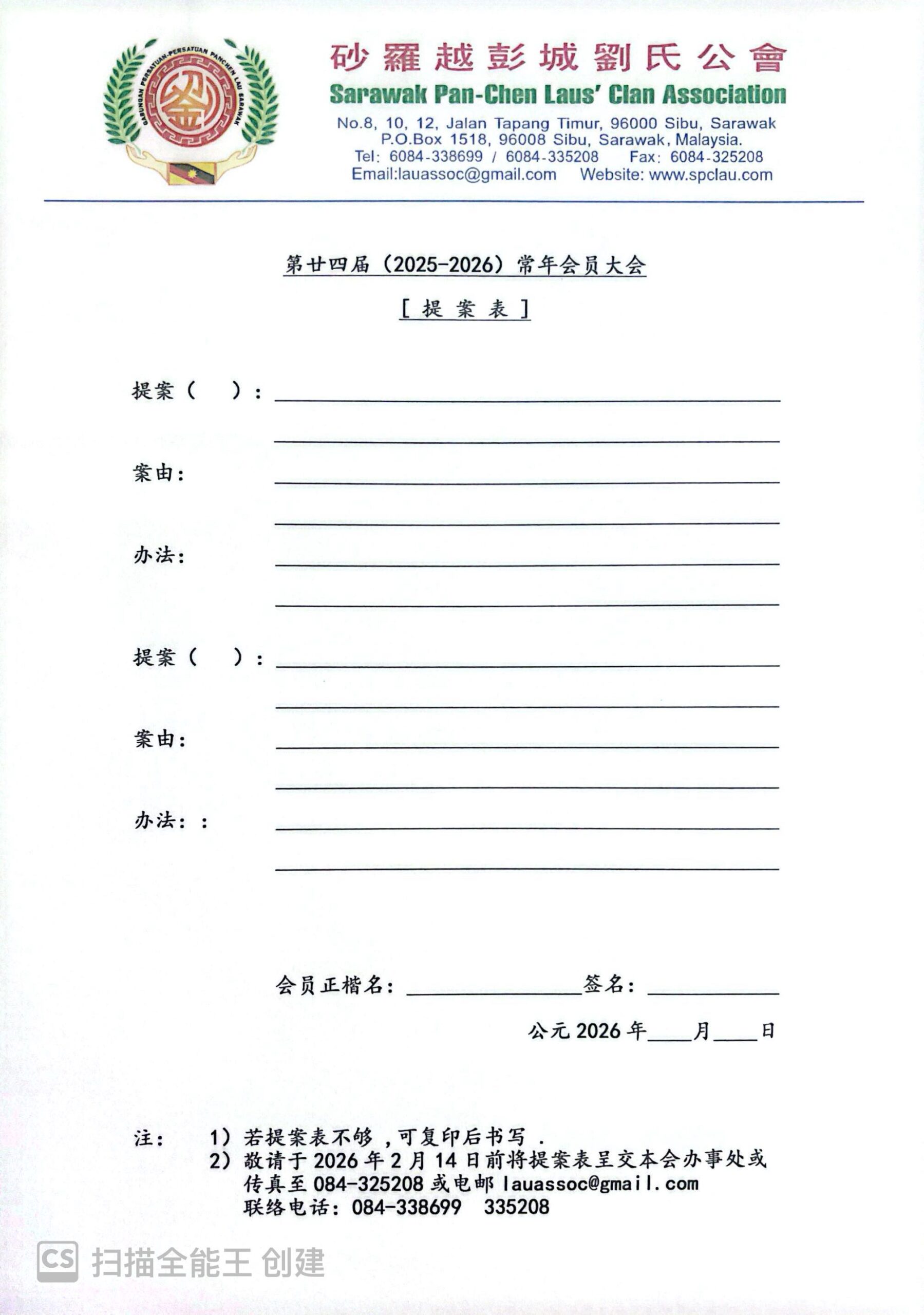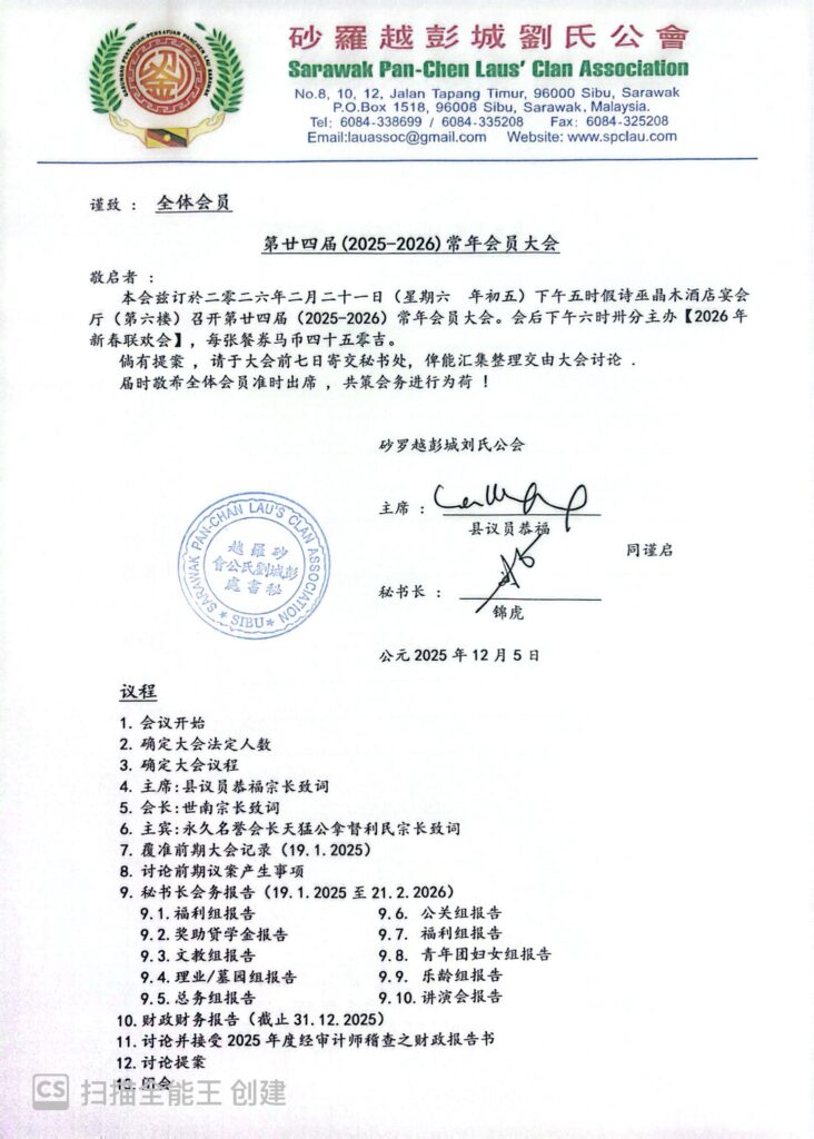 【通告】砂罗越彭城刘氏公会第廿四届(2025-2026)常年会员大会--21-2-2026 Posted by admin | On 19 12 月,2025 | In 未分類 Related Posts 【通告】泗里街彭城刘氏公会主办第27届(2013)砂沙汶彭城刘氏宗亲【嘉年华会】-砂罗越彭城刘氏公会各组领队/主任/干事/代表名单出炉-13-15/12/2013 砂罗越彭城刘氏公会讲演会第146次练习会--28-1-2015 砂罗越彭城刘氏公会青年团妇女组联合主办第三十三届(2019)砂沙汶彭城刘氏宗亲【嘉年华会】各项选拔赛程序表--17-18/8/2019 About Author admin Leave a Reply發佈留言必須填寫的電子郵件地址不會公開。 必填欄位標示為 *顯示名稱 * 電子郵件地址 * 個人網站網址 在瀏覽器中儲存顯示名稱、電子郵件地址及個人網站網址,以供下次發佈留言時使用。 Δ