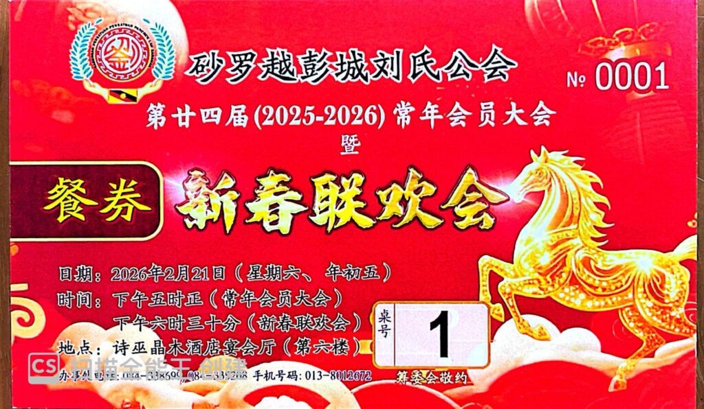 砂罗越彭城刘氏公会将于2026年2月21日(星期六,年初五)下午5时,假诗巫晶木酒店六楼宴会厅召开第廿四届(2025–2026)常年会员大会。大会结束后,将于当晚6时30分在同一地点主办2026年新春联欢晚会。