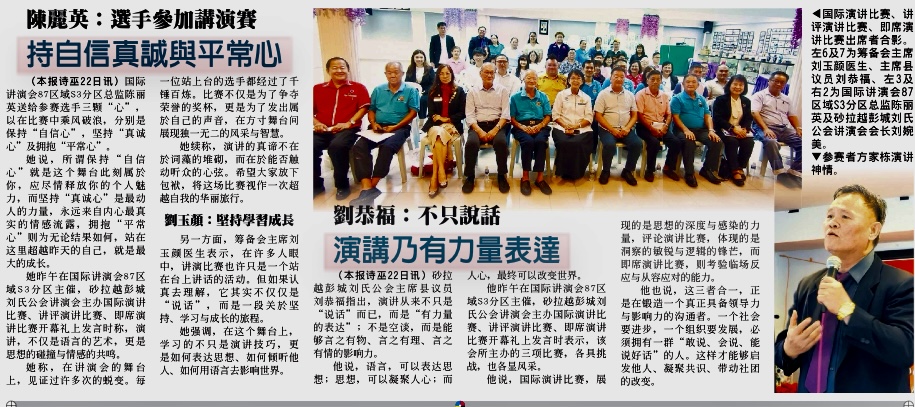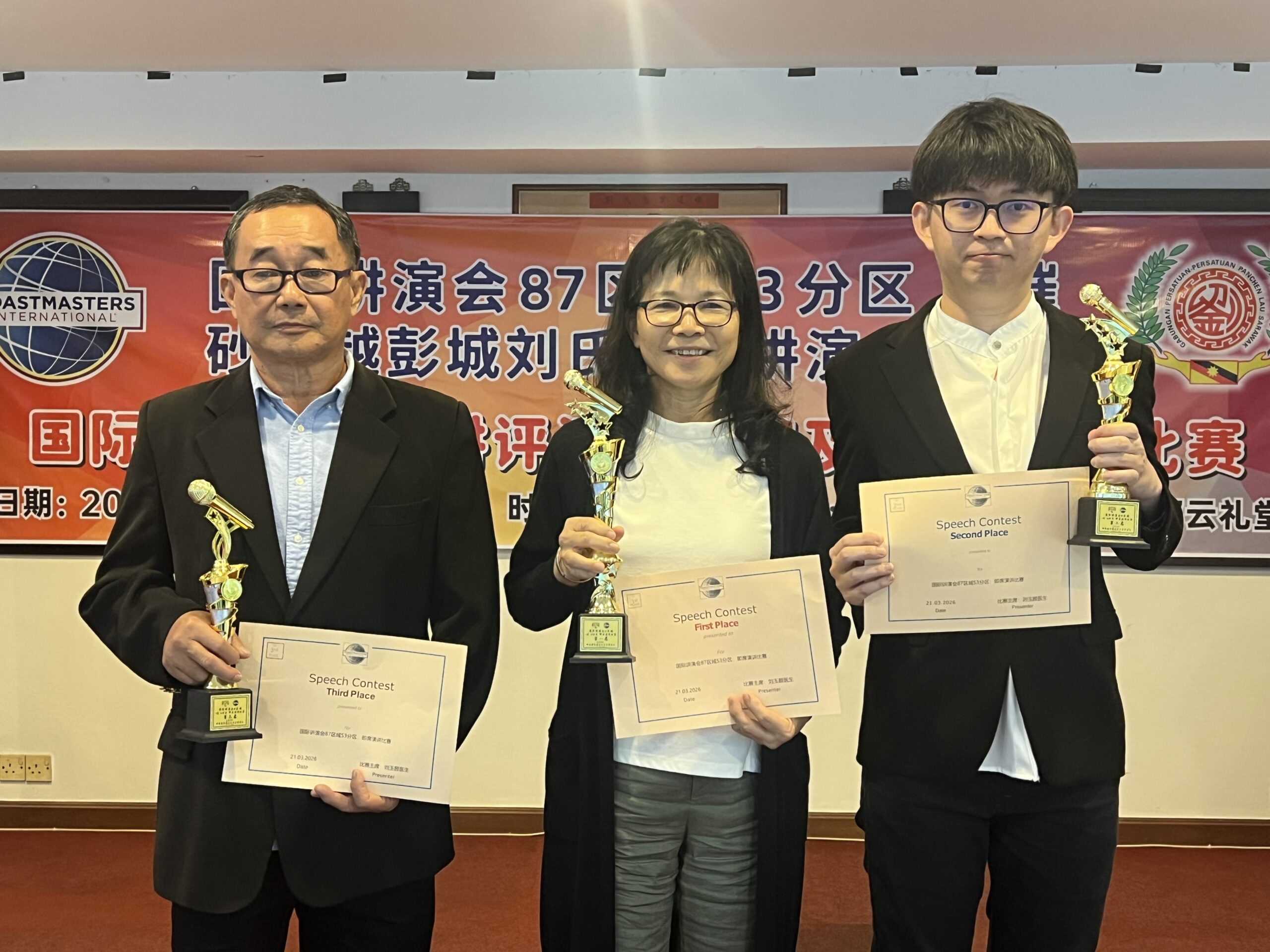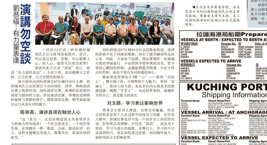 国际讲演会87区域S3分区主催.砂罗越彭城刘氏公会讲演会主办【国际演讲比赛,讲评比赛及即席演讲比赛】-21-3-2026 Posted by spclau spclau | On 24 3 月,2026 | In 未分類 国际讲演会87区域S3分区主催.砂罗越彭城刘氏公会讲演会主办【国际演讲比赛,讲评比赛及即席演讲比赛】-21-3-2026 各组比赛成绩如下:#国际演讲比赛第一名:陆择顺(福州讲演会)第二名:黄欣柔(陈氏讲演会)第三名:丁华娥(刘氏讲演会)#讲评比赛第一名:黄欣柔(陈氏讲演会)第二名:张光顺(闽清讲演会)第三名:丁华娥(刘氏讲演会)#即席演讲比赛第一名:卓丽华(福州讲演会)第二名:陈作维(陈氏讲演会)第三名:刘坤文(刘氏讲演会) Related Posts 砂罗越彭城刘氏公会青年团妇女组联合主办砂沙汶彭城刘氏宗亲【嘉年华会】歌唱组选拔赛--25-8-2012 砂罗越彭城刘氏公会出席参加彭亨州百乐县刘氏宗亲会创会18周年会庆暨庆贺会员子女学成与孝亲敬老新春联欢晚宴--18-1-2014 砂罗越彭城刘氏公会联合总会第六届第五次理事会议在美里省彭城刘氏公会召开--15-12-2012 刘总第六届第五次理事会议在美里省彭城刘氏公会召开--15-12-2012 About Author spclau Leave a Reply發佈留言必須填寫的電子郵件地址不會公開。 必填欄位標示為 *顯示名稱 * 電子郵件地址 * 個人網站網址 在瀏覽器中儲存顯示名稱、電子郵件地址及個人網站網址,以供下次發佈留言時使用。 Δ