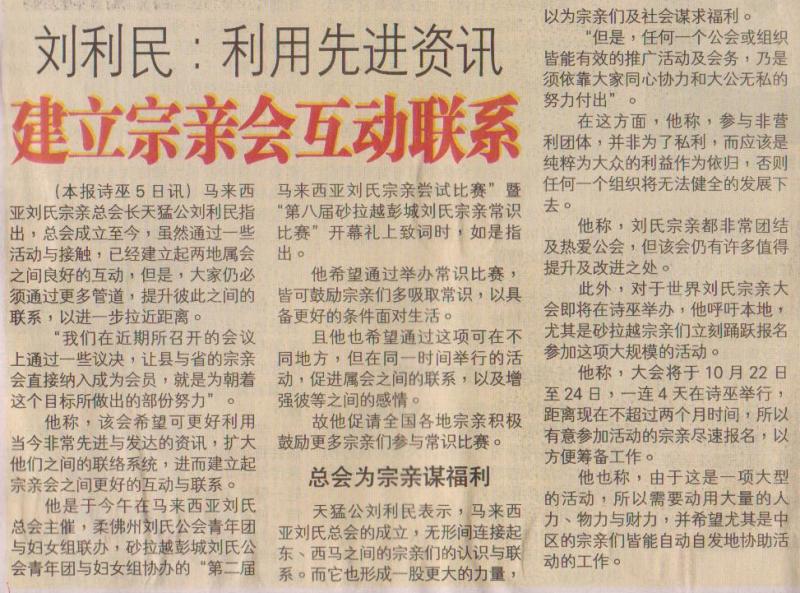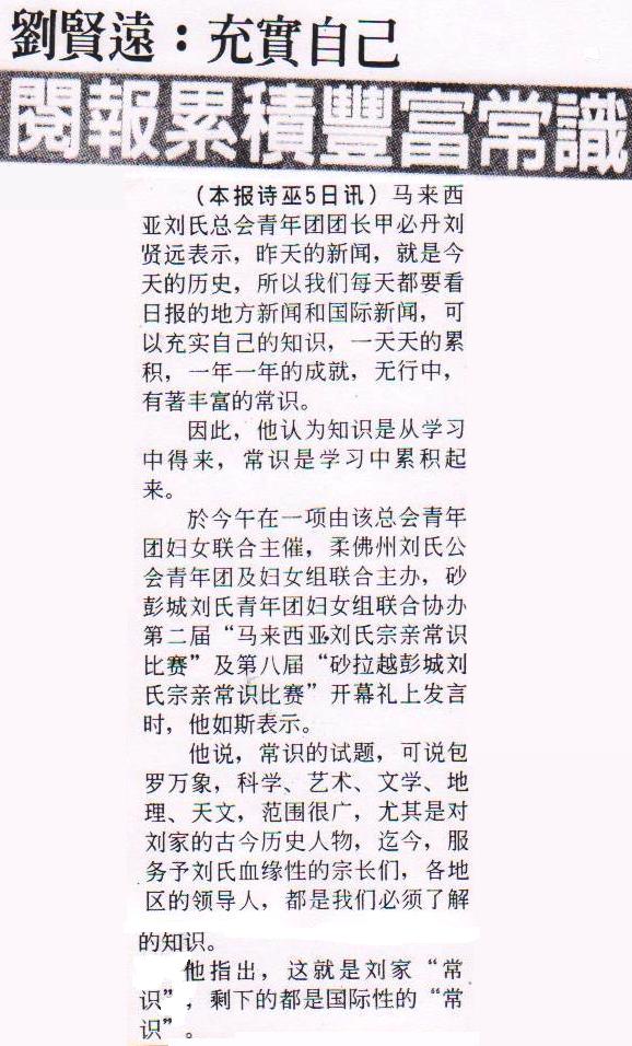 马来西亚刘氏总会,青年团,妇女组联合主催柔佛州刘氏公会青年团,妇女组联合主办,各州刘氏公会协办至第二届刘氏宗亲[常识比赛]定于2010年9月5日下午二时正各会同时举行。诗巫假拉让花园小学举行。