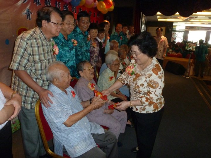 耆老在理事陪同下切孝亲节蛋糕。左起为刘锦成,副主席刘伯举,青年团团长甲必丹刘贤远,署理会长刘久生,妇女组主任甲必丹刘文惠,名誉会长刘瑞源,妇女组顾问拿汀斯里黄淑贞,会长天猛公刘利民,筹备会主席黎月娇,刘强举,乐龄组主任刘人群,副主席甲必丹刘乃祯,副主席刘会福。