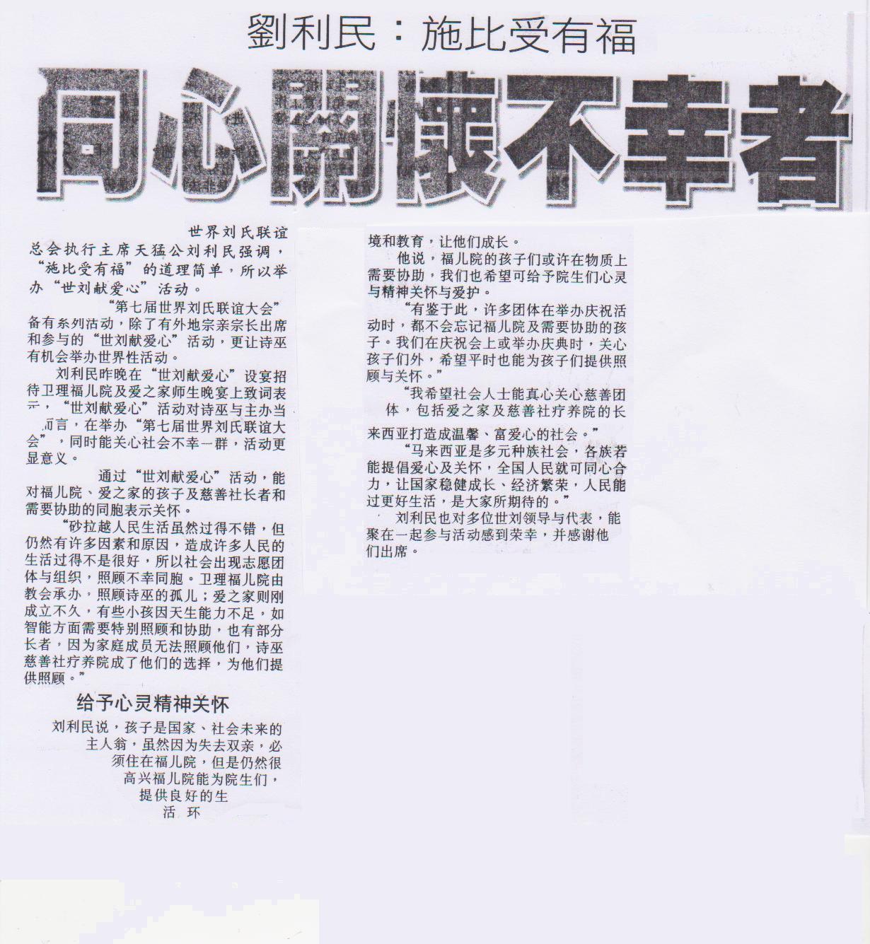 本团及本组联合主办(世刘献爱心),中午慈善疗养院,晚上喜来登餐厅,主宾为本会妇女组顾问拿汀斯里黄淑贞宗长【20.10.2010】 Posted by admin | On 20 10 月,2010 | In 未分類 贵宾与世界各地的刘氏宗亲在“世刘献爱心”晚宴上联合切爱心蛋糕,前排右起砂彭城刘氏公会署理主席本固鲁本武,副主席甲必丹乃祯,华团会长拿督刘乃好,新加坡刘氏总会主席刘国华,世刘执行主席兼会长刘利民,新加坡刘氏总会主席夫人李慧,黄淑贞,筹备会主席刘春英及来自中国深圳的王宛中,广东的刘耕,平顶山的全新,新山的昭魁以及新加坡的南生 Related Posts 【通告】砂罗越彭城刘氏公会乐龄组庆祝成立十週年纪念暨组员庆生晚宴--27.10.2014 砂罗越彭城刘氏公会联合总会前往中国福建省凤岗刘氏宗祠寻根敬祖---15-4-2018 砂罗越彭城刘氏公会网上更新族谱及增加新户口新闻稿--31-7-2020 About Author admin Leave a Reply發佈留言必須填寫的電子郵件地址不會公開。 必填欄位標示為 *顯示名稱 * 電子郵件地址 * 個人網站網址 在瀏覽器中儲存顯示名稱、電子郵件地址及個人網站網址,以供下次發佈留言時使用。 Δ