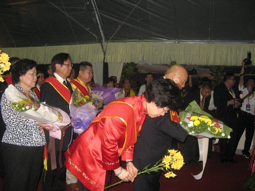 最后 大家懷著崇敬的心情向劉累公三鞠躬,行祭拜禮,各地代表團團長也列隊獻花。