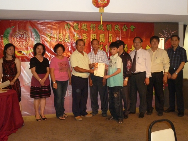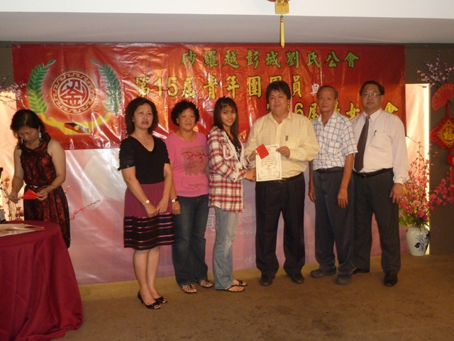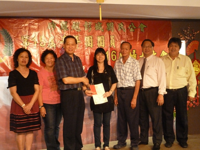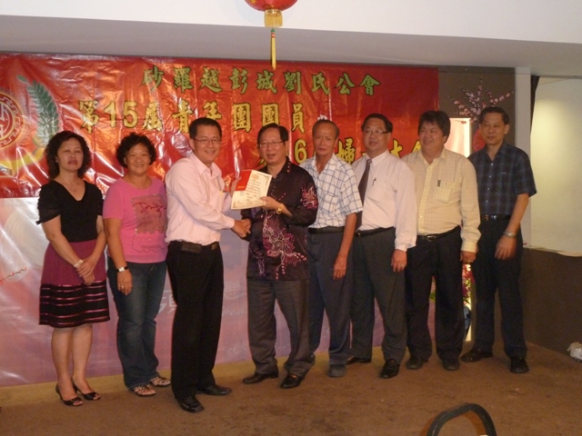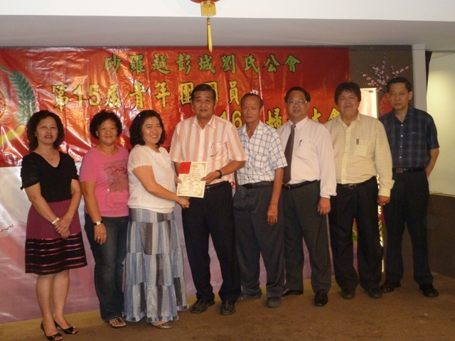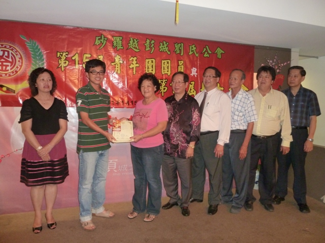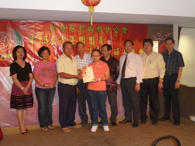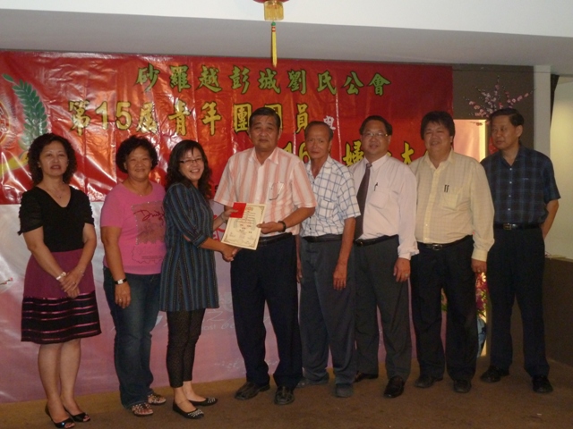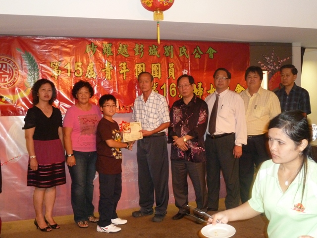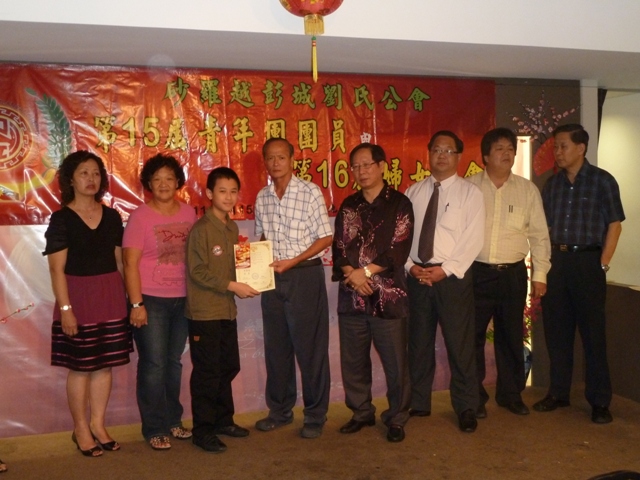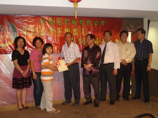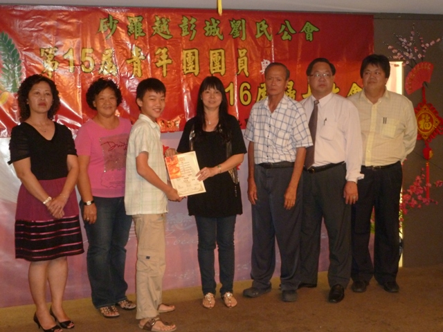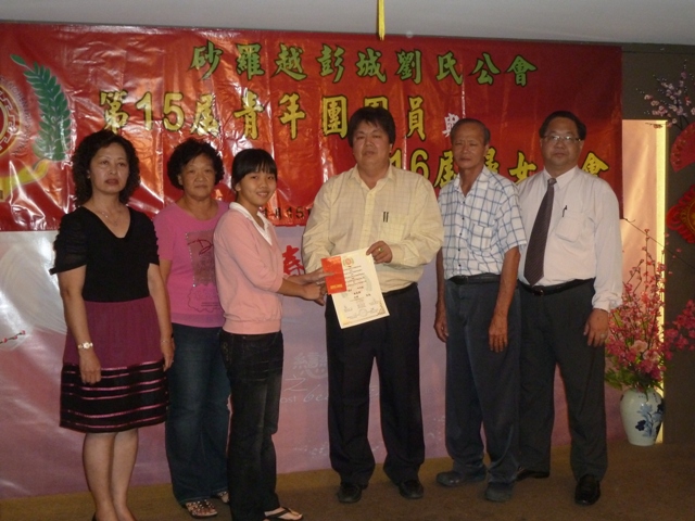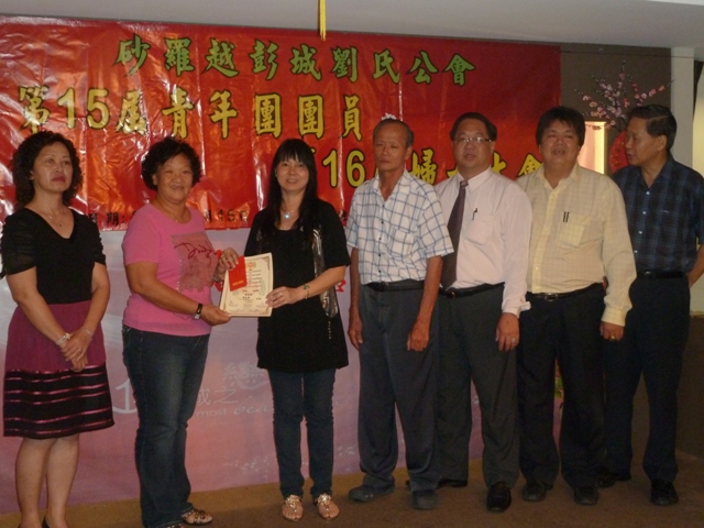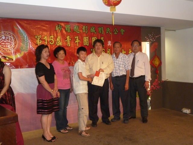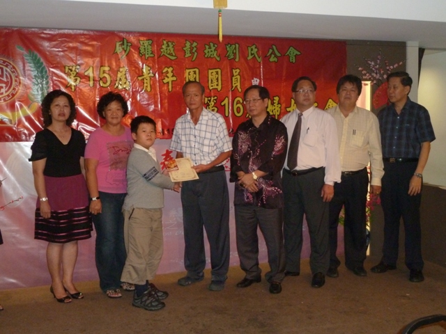 马来西亚刘氏总会青年团妇女组主催.柔佛州刘氏公会青年团妇女组联合主办.各州属属会协办.第二届[马来西亚刘氏宗亲常识比赛]暨第八届[砂罗越彭城刘氏宗亲常识比赛]颁奖礼.获得全砂小学组安慰奖刘必鸿(左3)由本会副主席甲必丹刘乃祯(右3)颁发.左起妇女组秘书黄桂萍,筹备会主席黄于芳,右起为团长甲必丹刘贤远,乐龄组主任刘人群.