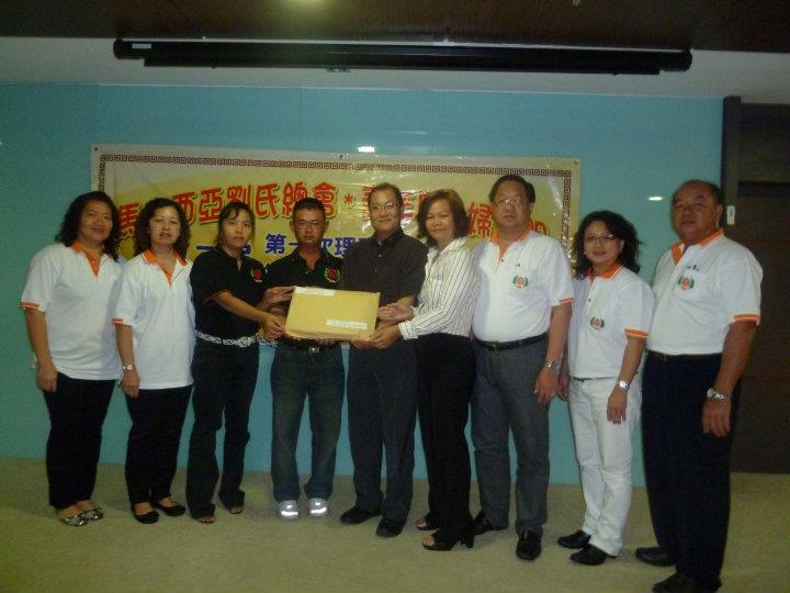 马刘总团长甲必丹刘贤远(右3)呈交主办单位森美兰刘氏公会青年团妇女组主任刘扬莲(左3)及青年团团长刘圆财(左4)接收,左起为马刘总妇女组财政汪丽华,秘书黄桂萍。右起为青年团秘书刘义锦,妇女组副主任刘琼清。
