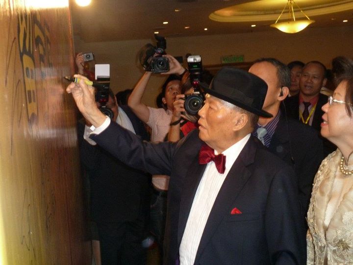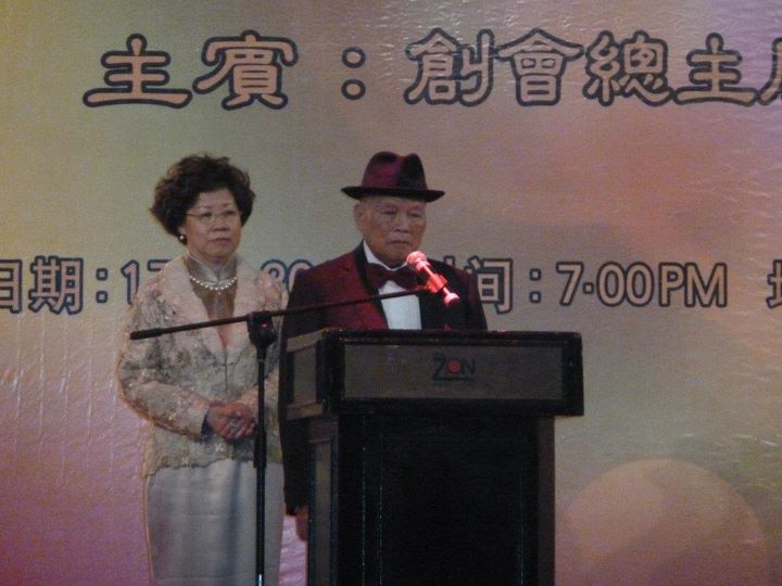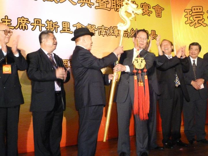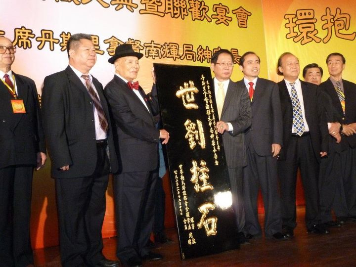 世界刘氏联谊总会第一届总主席丹斯里拿督刘南辉太平局绅将权锤移交给新届总主席天猛公刘利民。