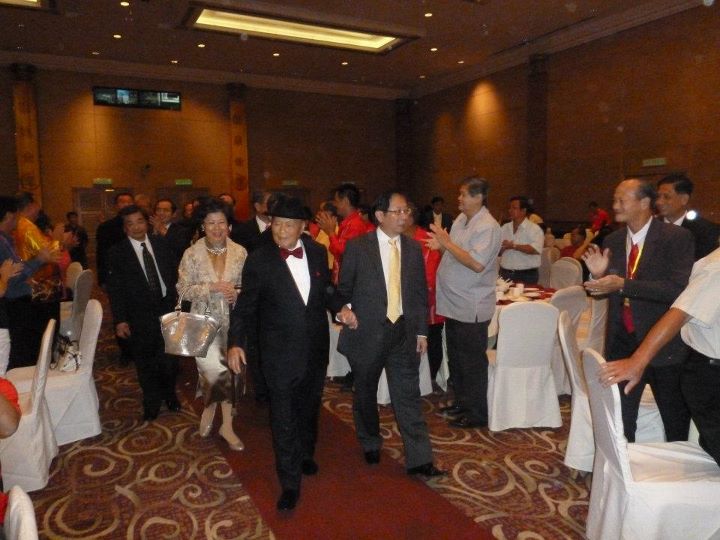 创会总主席兼名誉主席丹斯里拿督刘南辉太平局绅(左)与总主席天猛公刘利民步入会场受到热烈欢迎,后为潘斯里陈慧玉。
