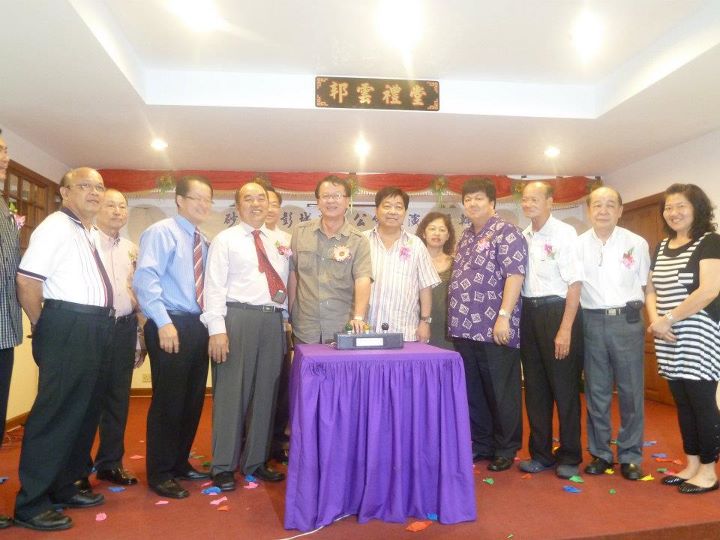 开幕人砂彭城刘氏公会副主席刘伯举(中)主持比赛的亮灯仪式时摄。左4,5及右6分别为本会讲演会会长刘宜福,筹备会主席刘义锦、本会署理主席本固鲁刘本武、妇女组秘书黄桂萍、副主席甲必丹刘乃祯、乐龄组主任刘人群。