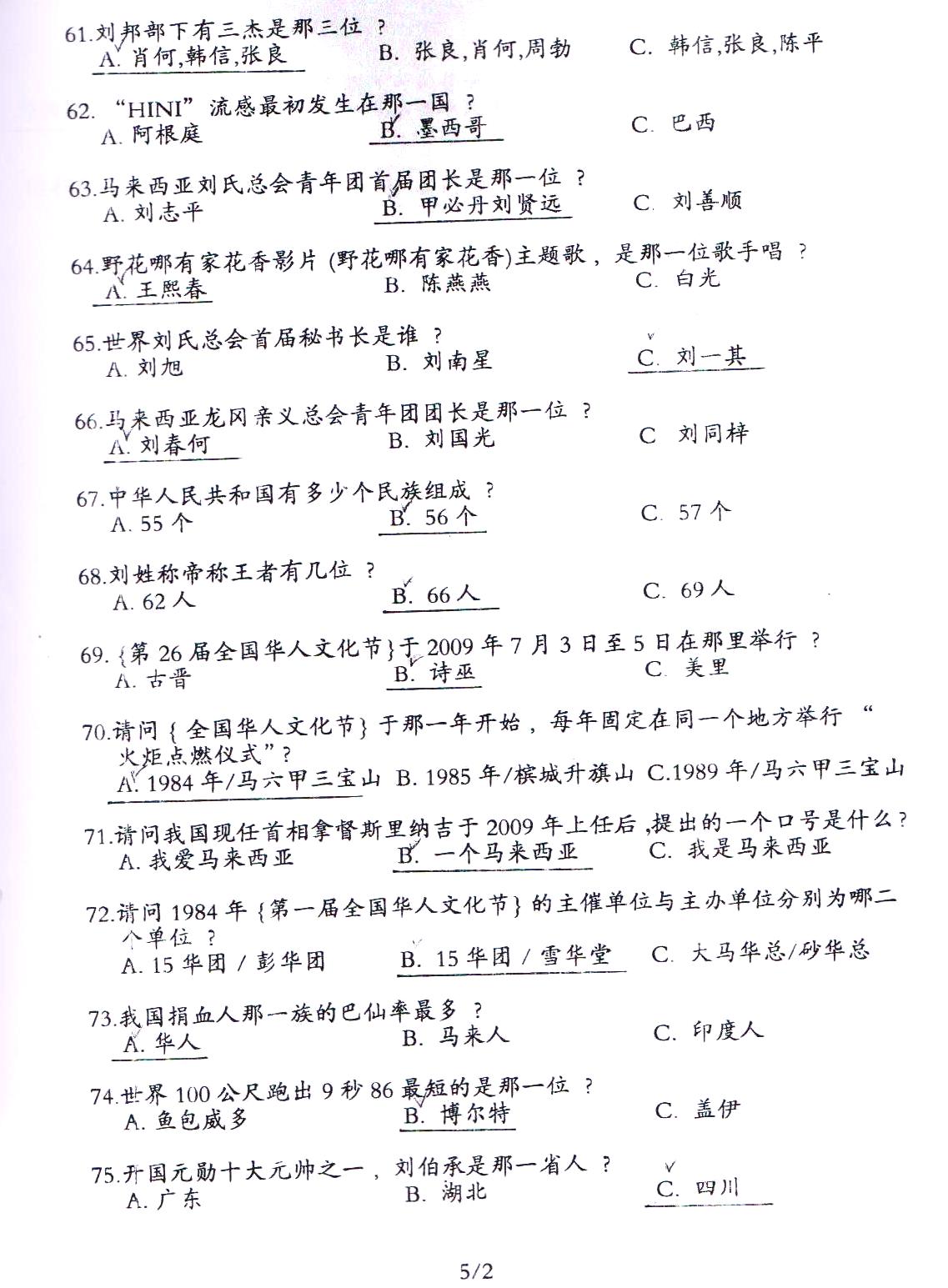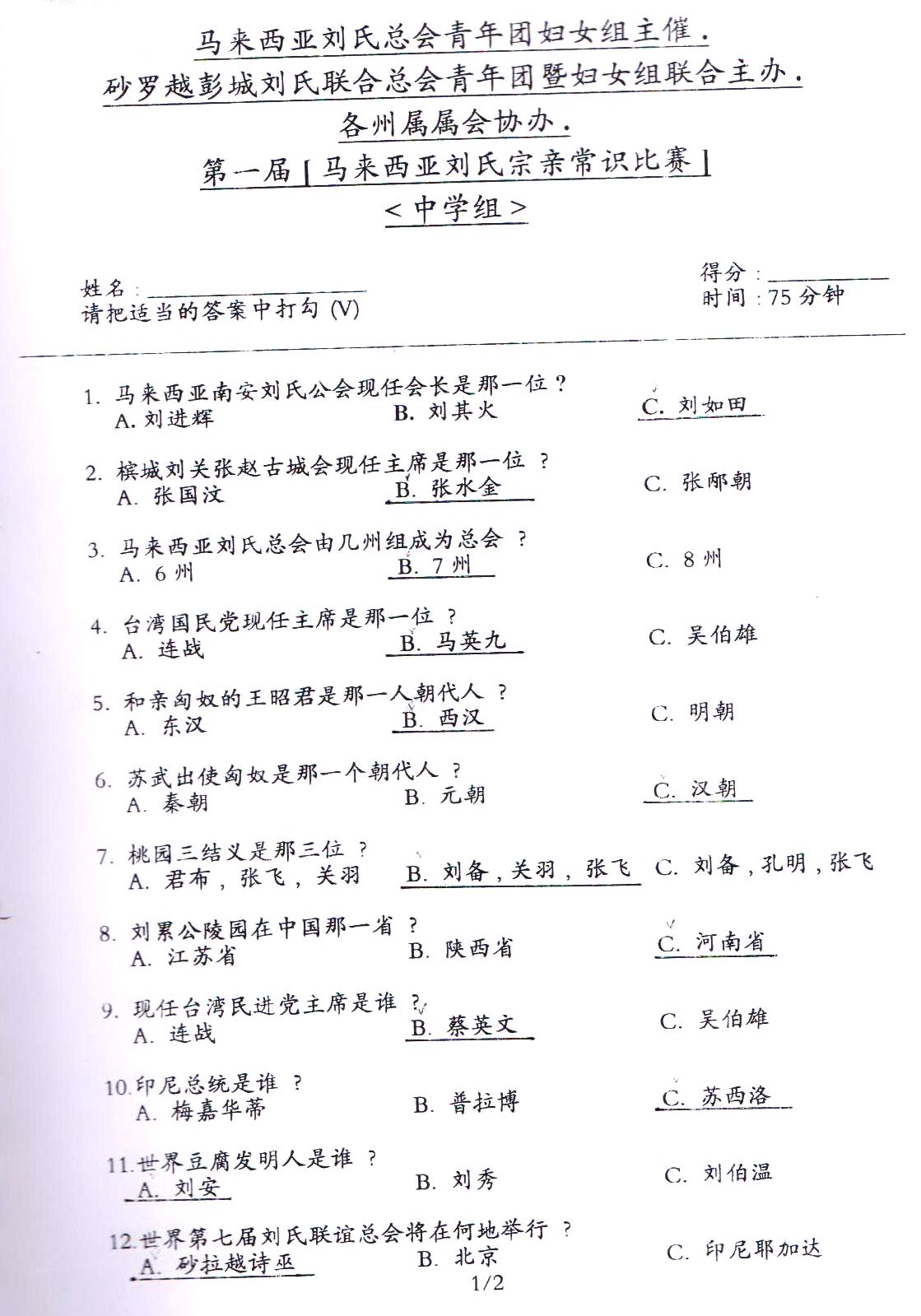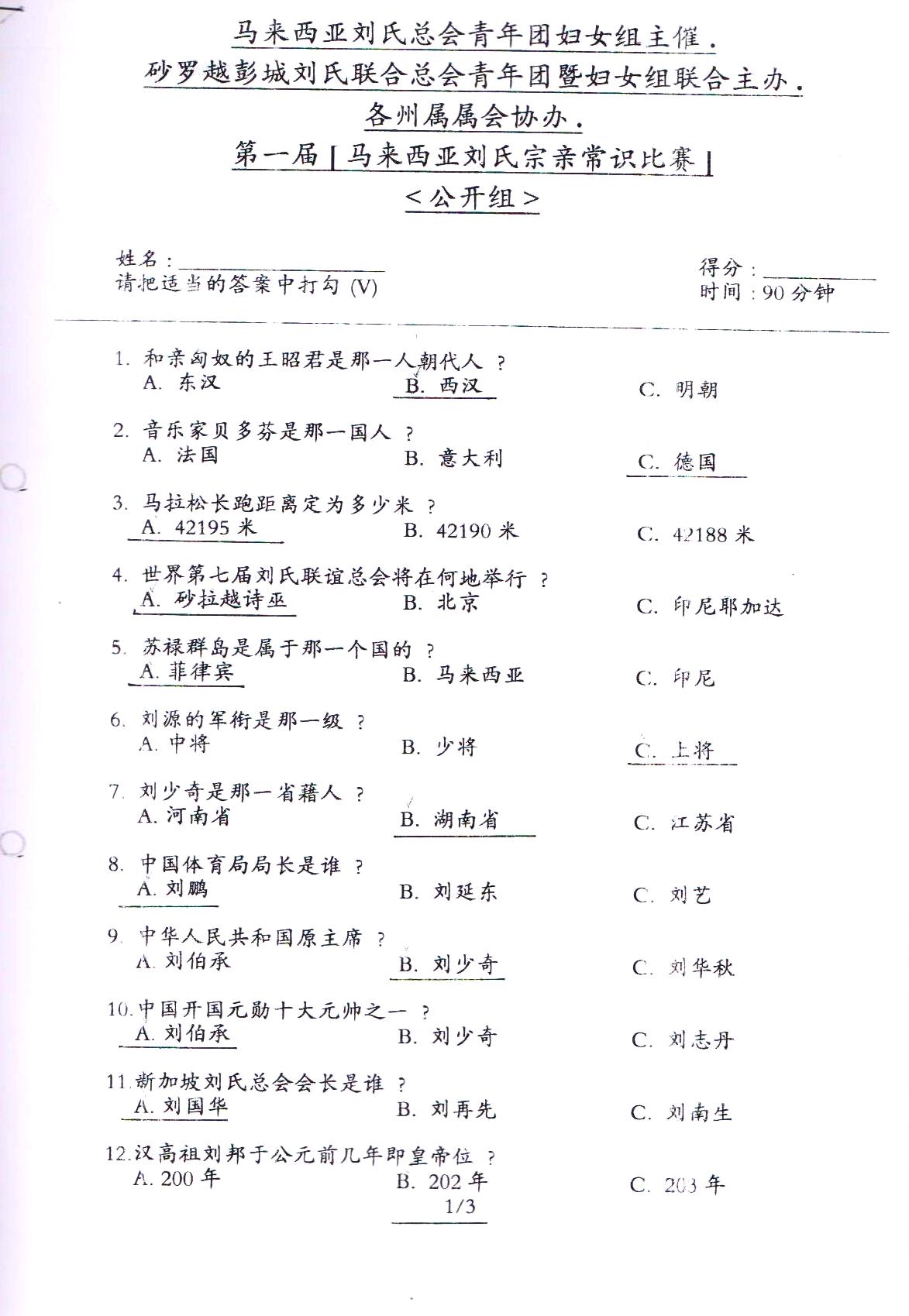 第一届【马来西亚刘氏宗亲常识比赛】暨 第七届【砂罗越彭城刘氏宗亲常识比赛】各组题目-2009年